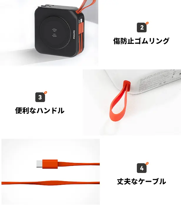 ケーブルとプラグが本体に内蔵されており、余計なアダプターやケーブルを別に用意する必要がなく、ワンストップでの充電が可能です。
