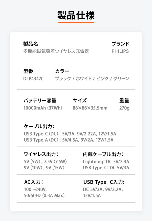 ●Magsafeワイヤレス、Type-C+Lightning、PD高速充電に対応した多機能仕様です。
