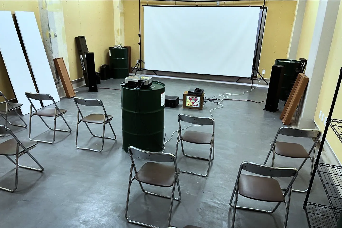 また、空間の広さや遮音・遮光性を活かしたレンタルスペースとしても貸し出せる空間にしたいと考えています。既に150インチのスクリーンやフルHDプロジェクター、スピーカー、多数の椅子やテーブル等の備品を揃えており上映施設、打ち上げや食事会、ミーティング、推し活などでも使える想定です。