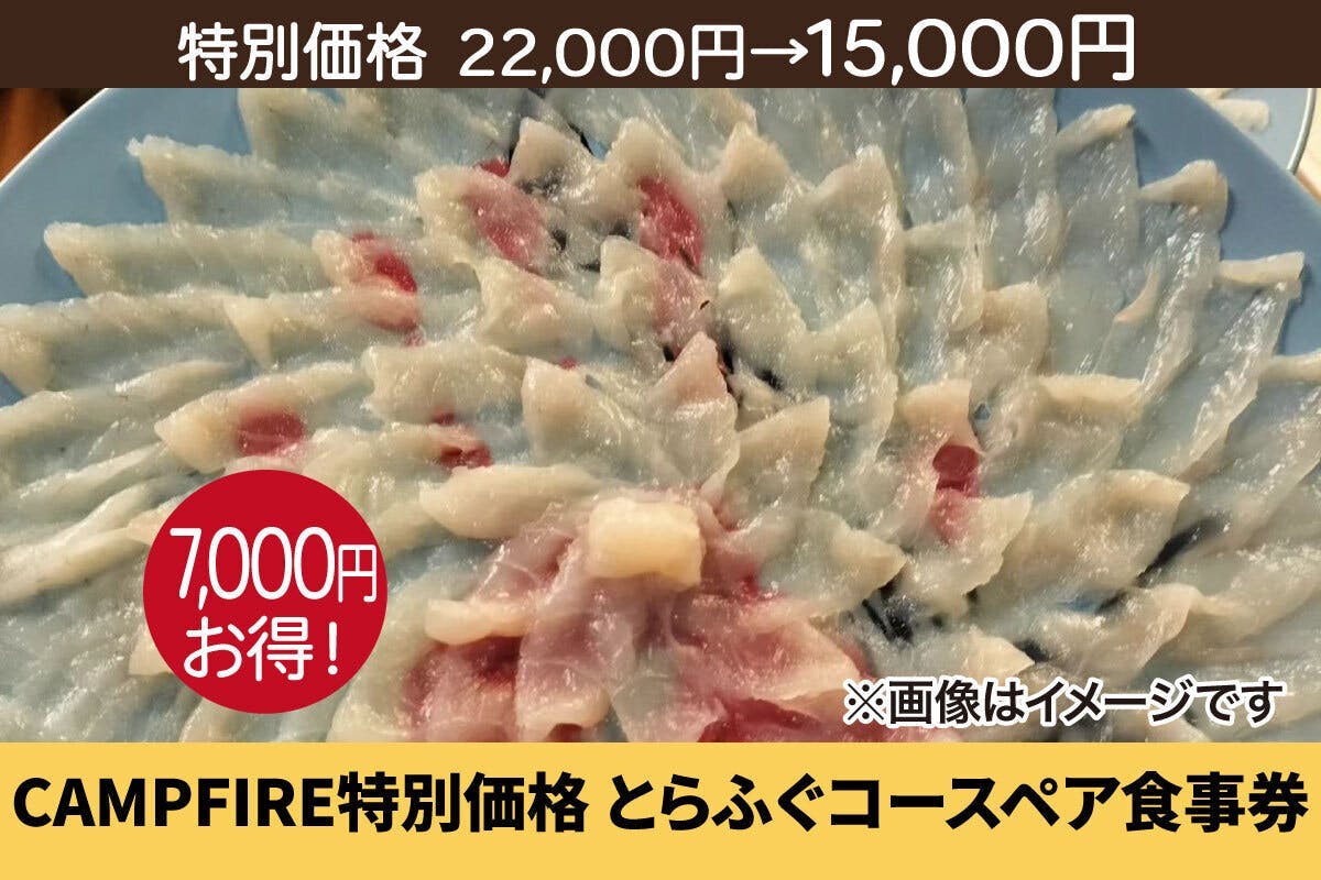 とらふぐコースペア食事券は、お店に来てくださる方へのとっておき!相撲茶屋長州場所の自慢のトラフグコースをお値打ち価格で味わっていただけます。感謝を込めたスパークリングワイン付きです。堪能していただけますように。