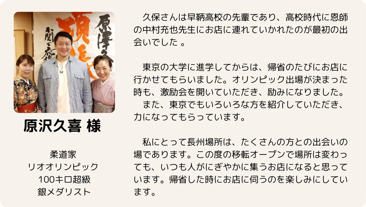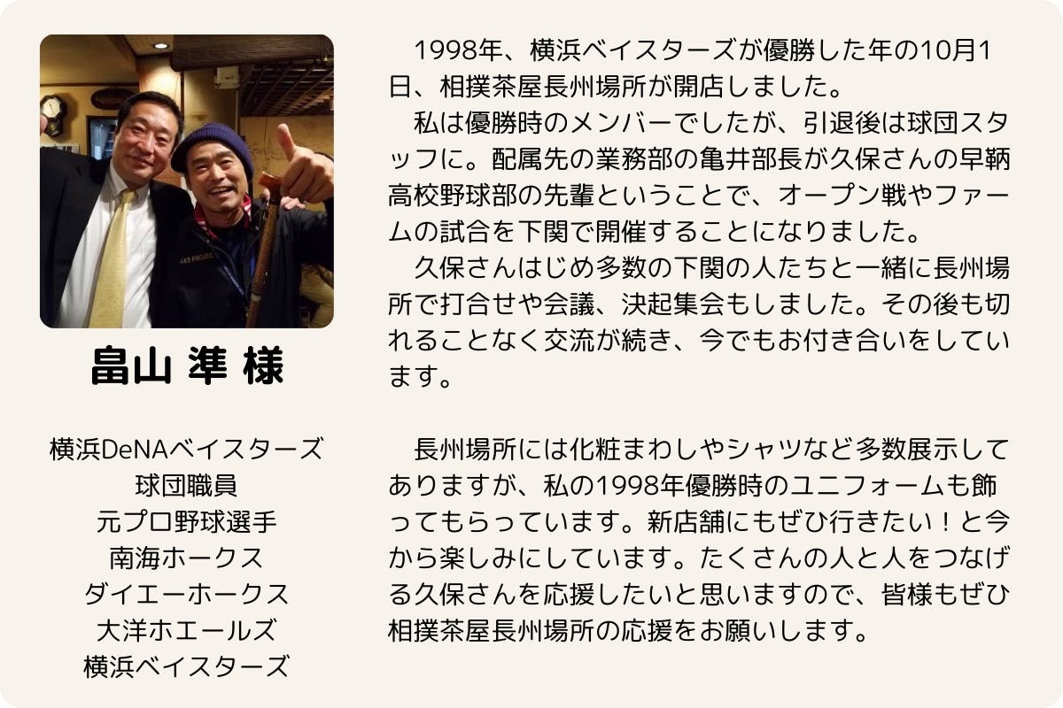 今回クラウドファンディングを行うと伺い、今まで長州場所にお世話になった僕たちに恩返しをさせていただきたいと思い、そんな声掛けをさせていただきます。プロジェクトの成功をお祈りいたします。