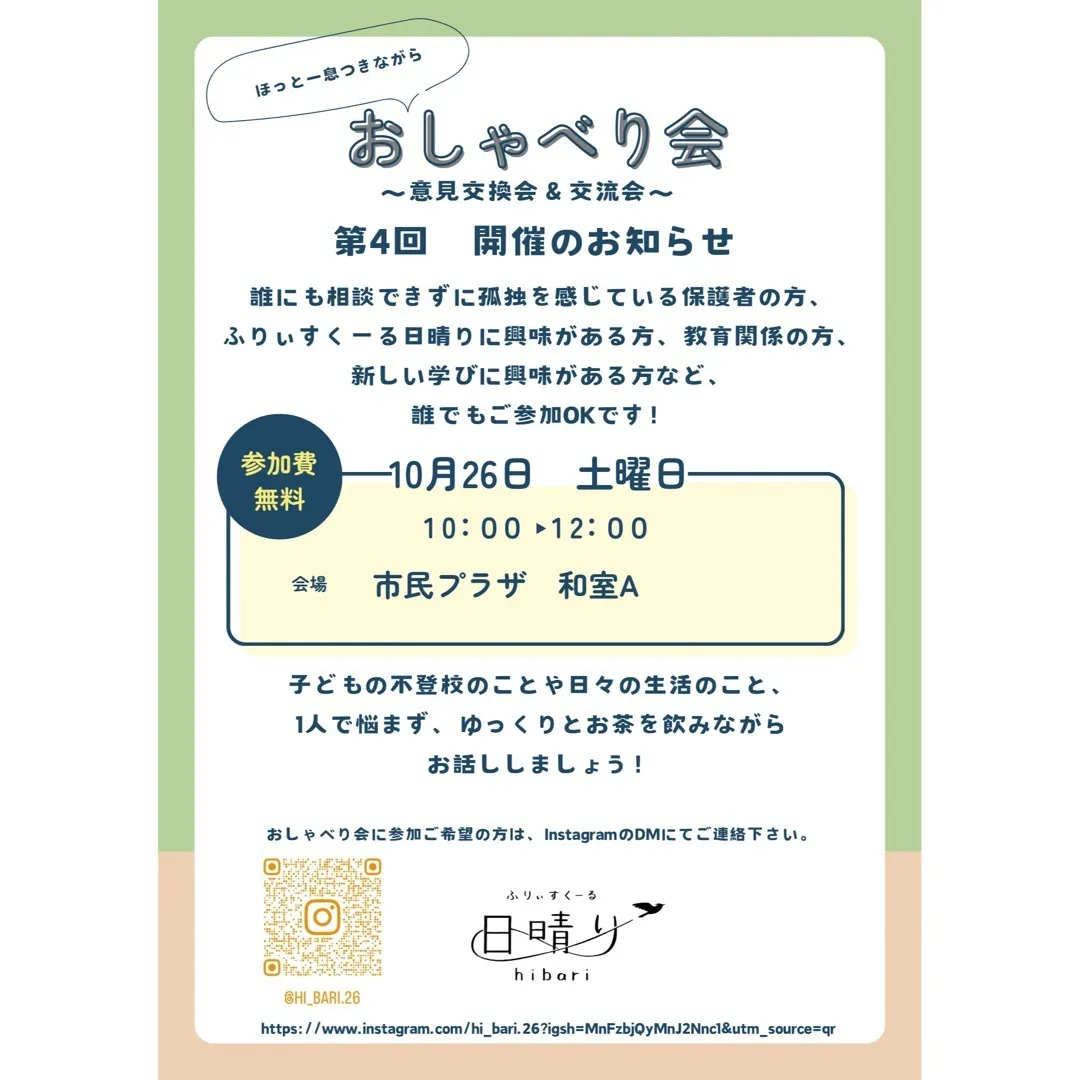 2024/10/27 13:1510月26日10時から、市民プラザさんにておしゃべり会を開催いたしました!日晴りの活動に対する意見や「多様性」への考えなど、色々な意見交換をすることができました。新しい出会いに感謝です☺︎ もっと見る