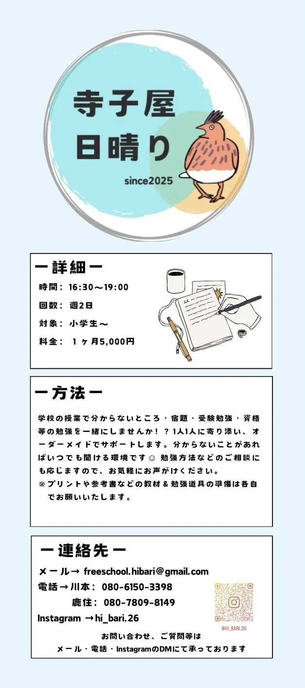 2024/11/10 08:322025年1月20日にオープンです!4月オープン予定だったのですが、拠点の準備も進んでいることから、早めにオープンすることにいたしました☺︎オープン報告と同時に『ふりぃすくーる日晴り』を利用する【ひばりっ子】『寺子屋 日晴り』を利用する【生徒】さんの募集を開始しました! もっと見る