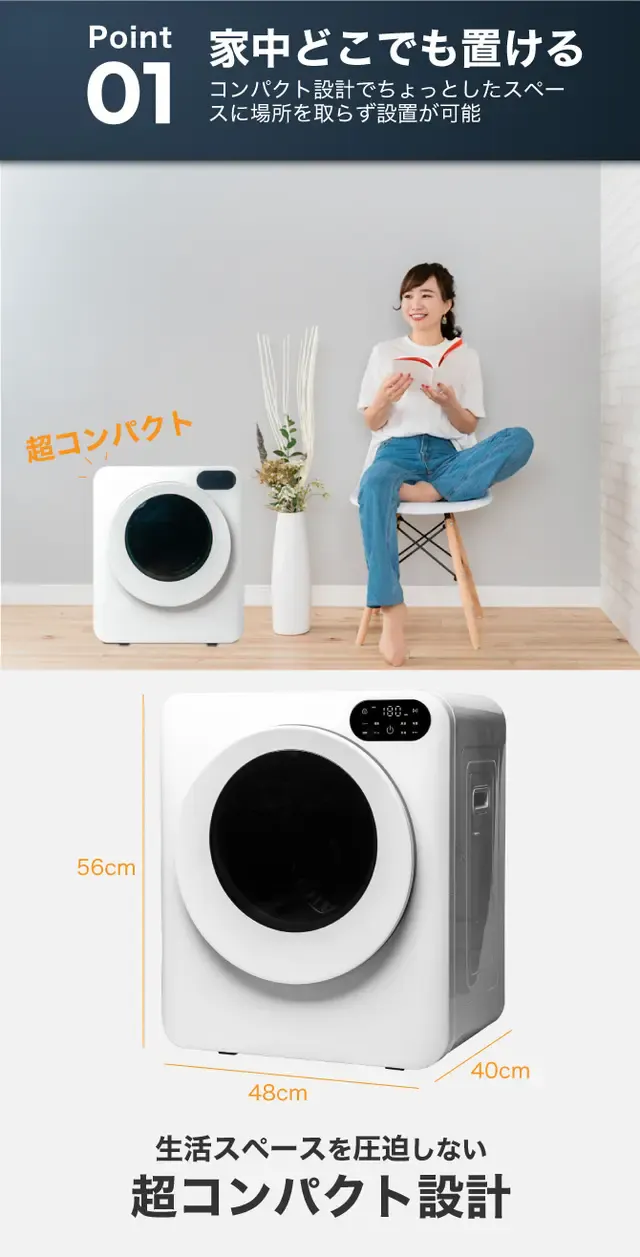この小型乾燥機は、わずかなスペースを利用して設置可能。床面積を圧迫することなく、お部屋を広々と使えるようになります。