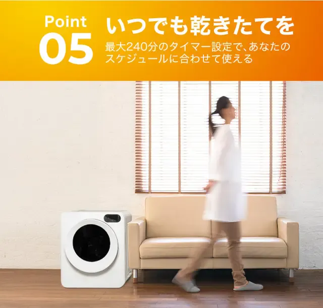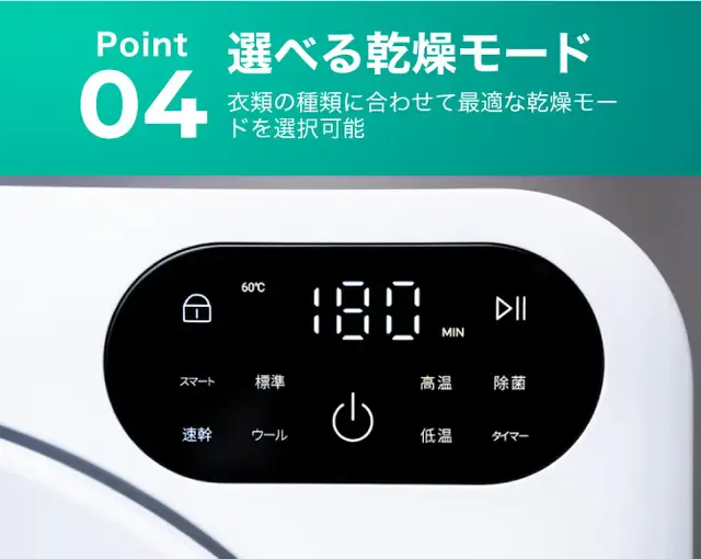 タイマーモードでは30、60、90、 120、150、180、210、240分の時間を選択することが可能です。あと少しだけ乾かしたい時は30分や60分、厚手の生地のものなどをしっかりと乾燥させたい時は240分など、用途やライフスタイルに合わせて自由に設定することができます。