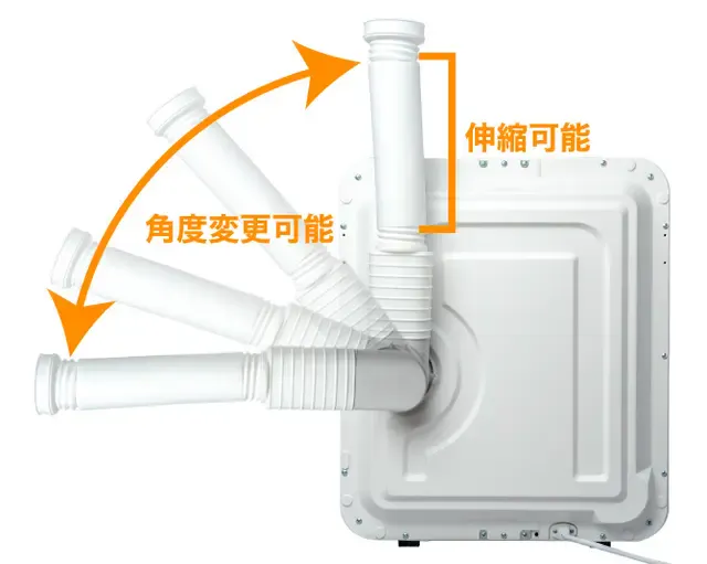 排気口のダクトは伸縮可能で55cmから約160cmの間で自由に設定できます。また、角度も変更可能で、お使いのシチュエーションに合わせて決められます。