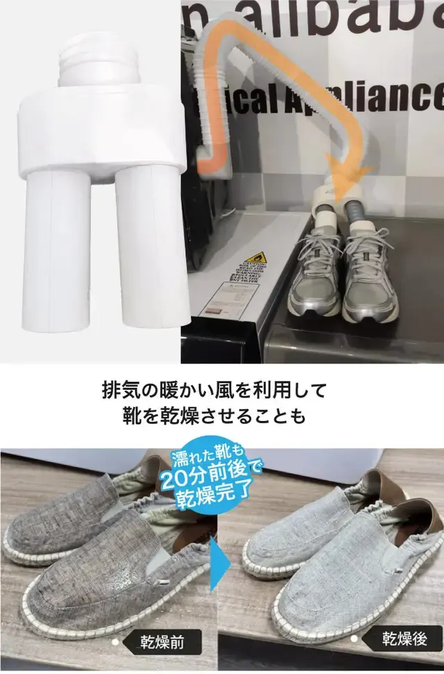 A:排気ホースを使用してオプションの靴乾燥に使用する事も可能です。狭い場所で排気が気になる場合は排気ホースを使用し排気方向を設定してください。