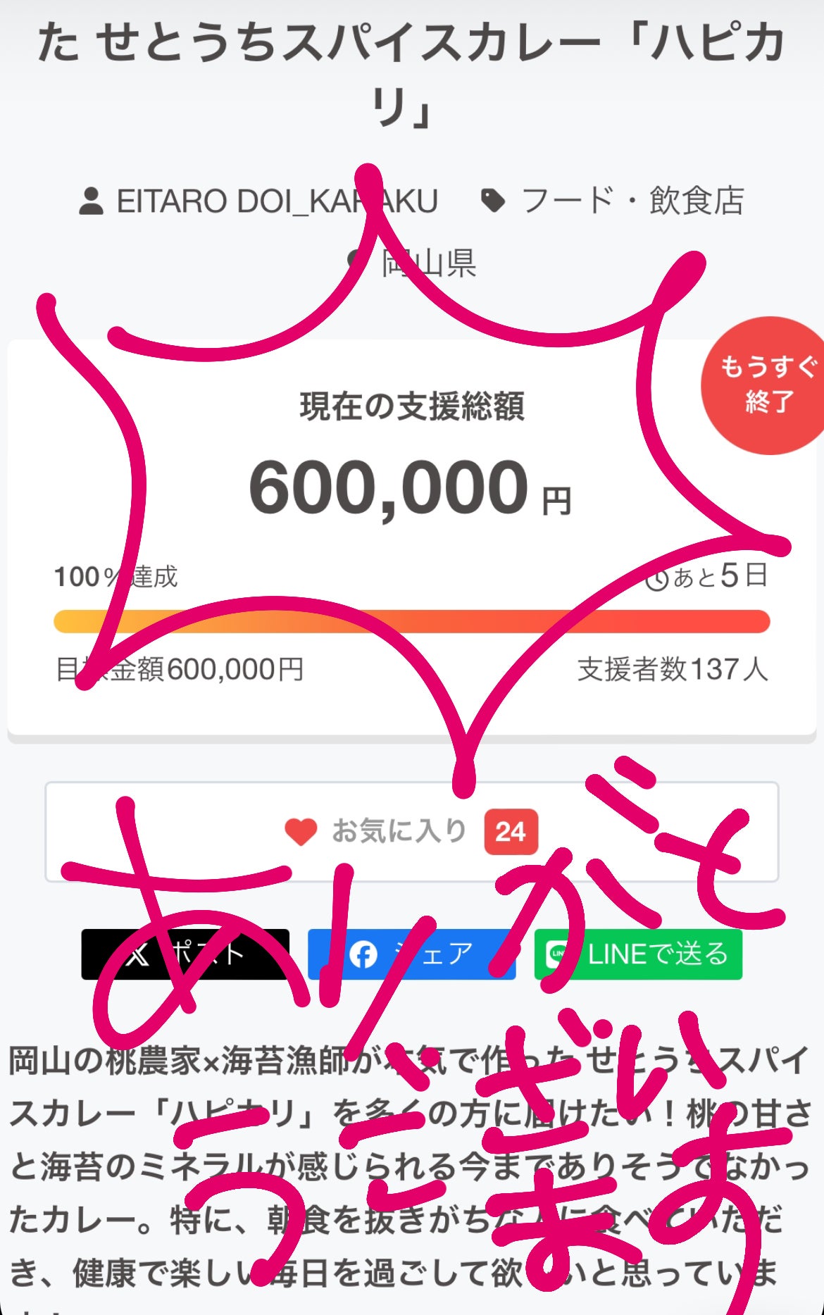 年の瀬にこんばんは!果樂ウェル美イング事業部ももっち。です。ハピカリセトウチPJ『めざましカリー』ご支援ありがとうございました!!お待たせしてましたハピカリをやっとみなさんの手元にお届けできました。ありがとうございました!!もう食べていただけましたか??わたしは朝カレーで元気にやってます〜笑みなさんももう食べられましたか??お味とかどうでした?よかったら同封してた用紙にあるGoogleアンケートにお答えお願いします。今後のハピカリはオンラインサイトでもお買い求めできますからよかったらおかわりしてくださいねー。※もし何かの手違いでまだ届いてないという方おられましたらご連絡お願いします。