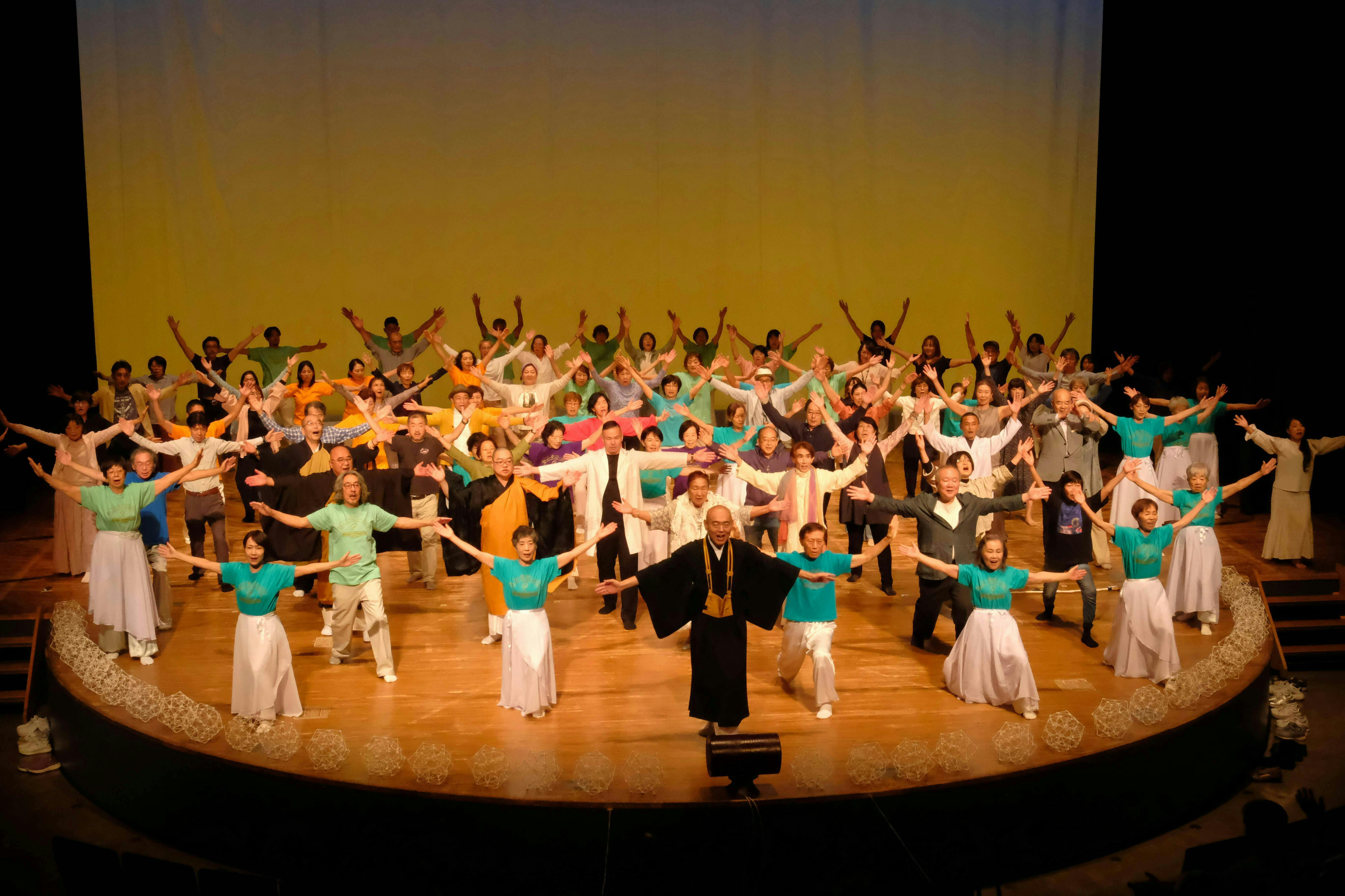 100人舞台中央は、実行委員長の東田樹治さん(真言宗僧侶)