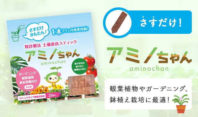 アミノちゃんは植物を元気にする、植物から抽出したアミノ酸(アスパラギン・グルタミン・アラシン・グリシンなど10種類以上のアミノ酸濃縮液)をパルプとデンプンに混ぜ合わせ固形化した発明商品です。