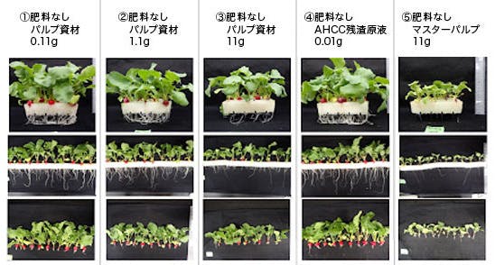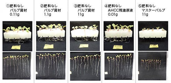当社既存商品の忌避剤の製造方法(大宝工業株式会社様ご協力)と同じように、菌体残渣をパルプに混ぜれば、セルロース効果もあいまってすごい効果が出るのではと思い、サンプルを製造し農家さんで植物の成長テストを始めました。