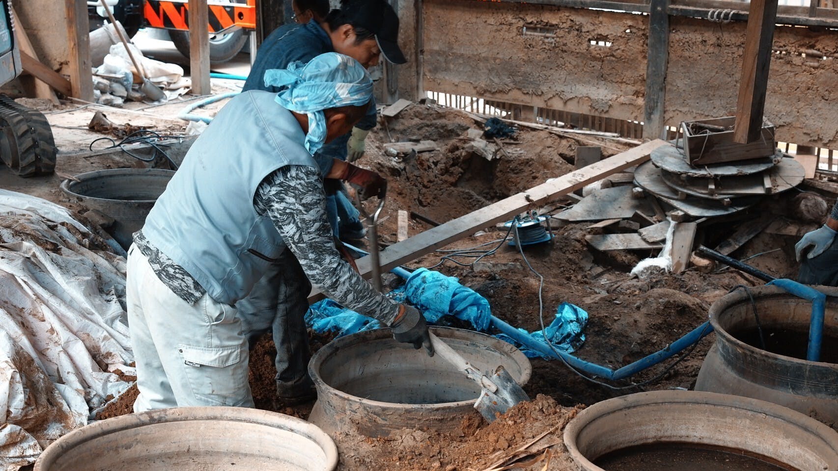 藍染めの容器として使用している甕(かめ)を取り出す作業が始まりました。