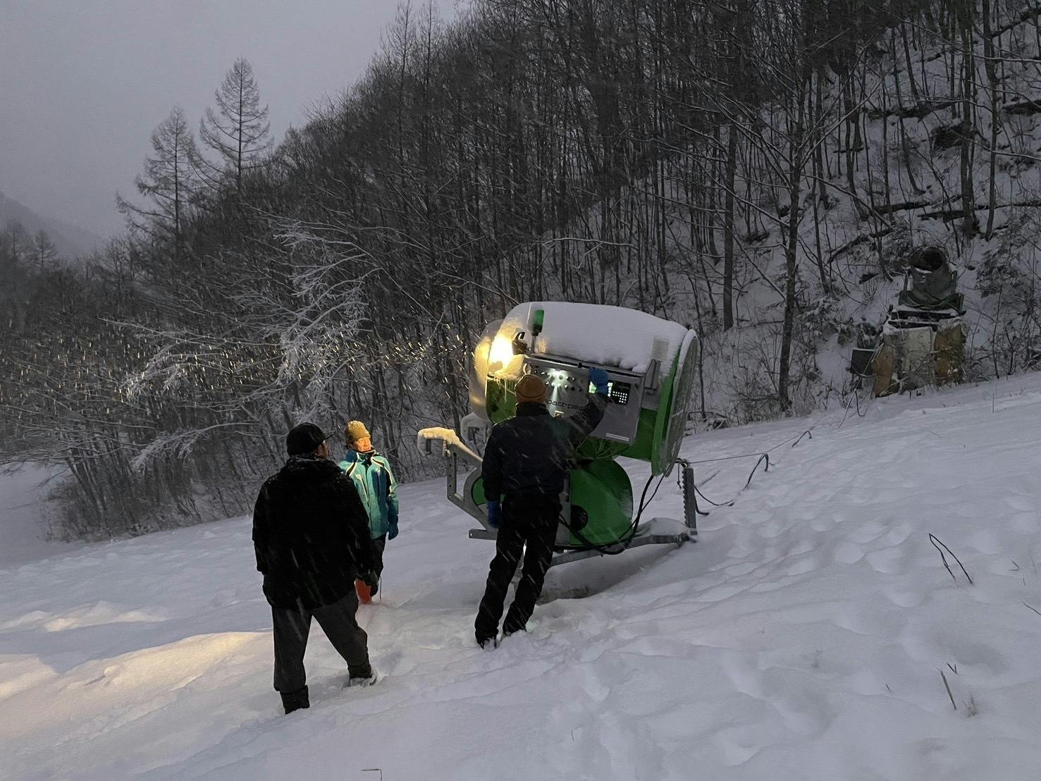 営業継続から急ピッチでオープンに向けて準備を進めており、古い降雪機のメンテナンスをなんとか行って数日前から人工降雪も合わせて行っております。