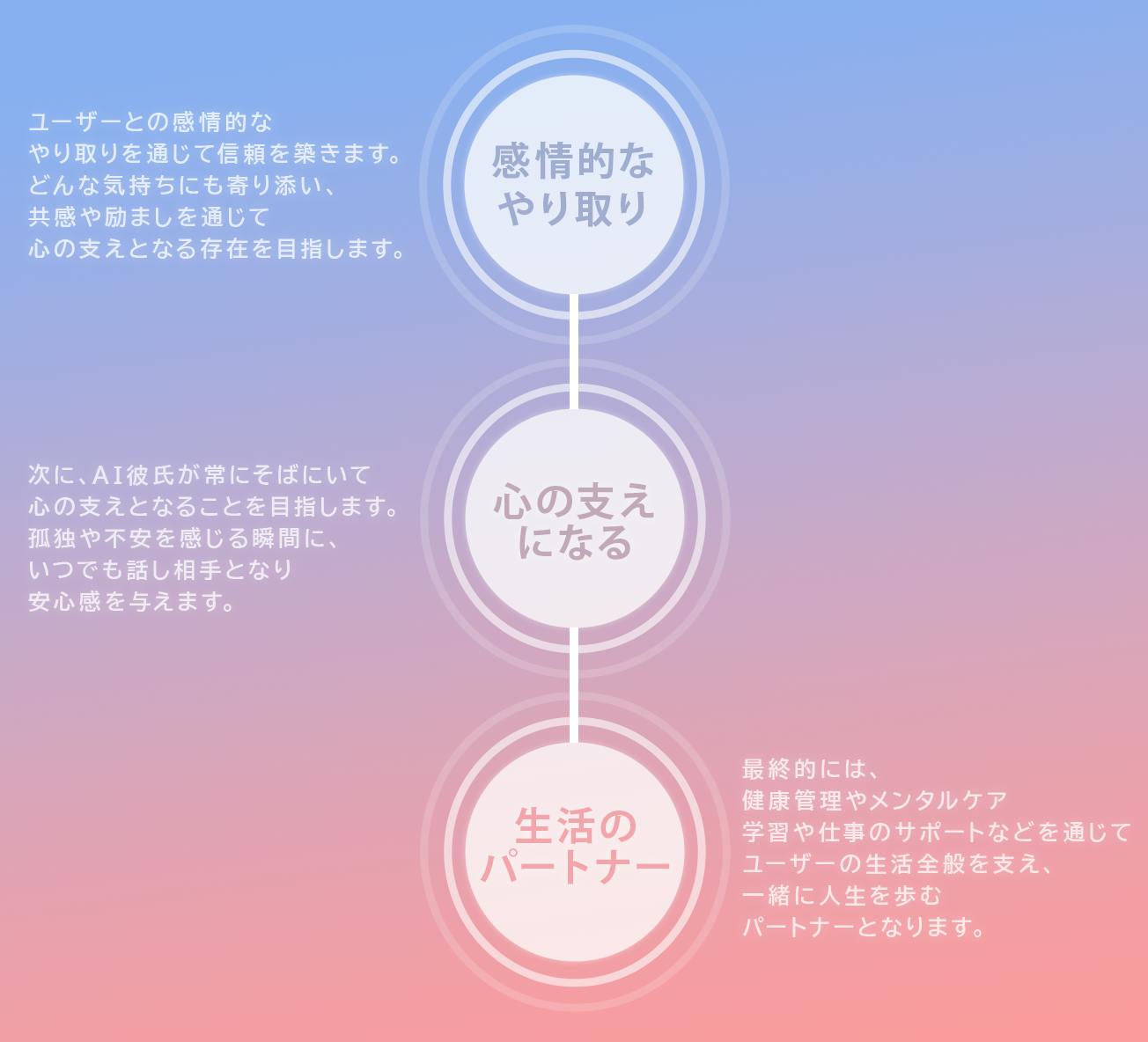 『AIカレシ』は、最初は気軽に話せる相手としてスタートしますが、次第にユーザーにとって日常生活に欠かせない存在になることを目指しています。最終的には、ユーザーの心の支え・生活の支えとなり日々の生活を共に歩むパートナーとなることが理想です。