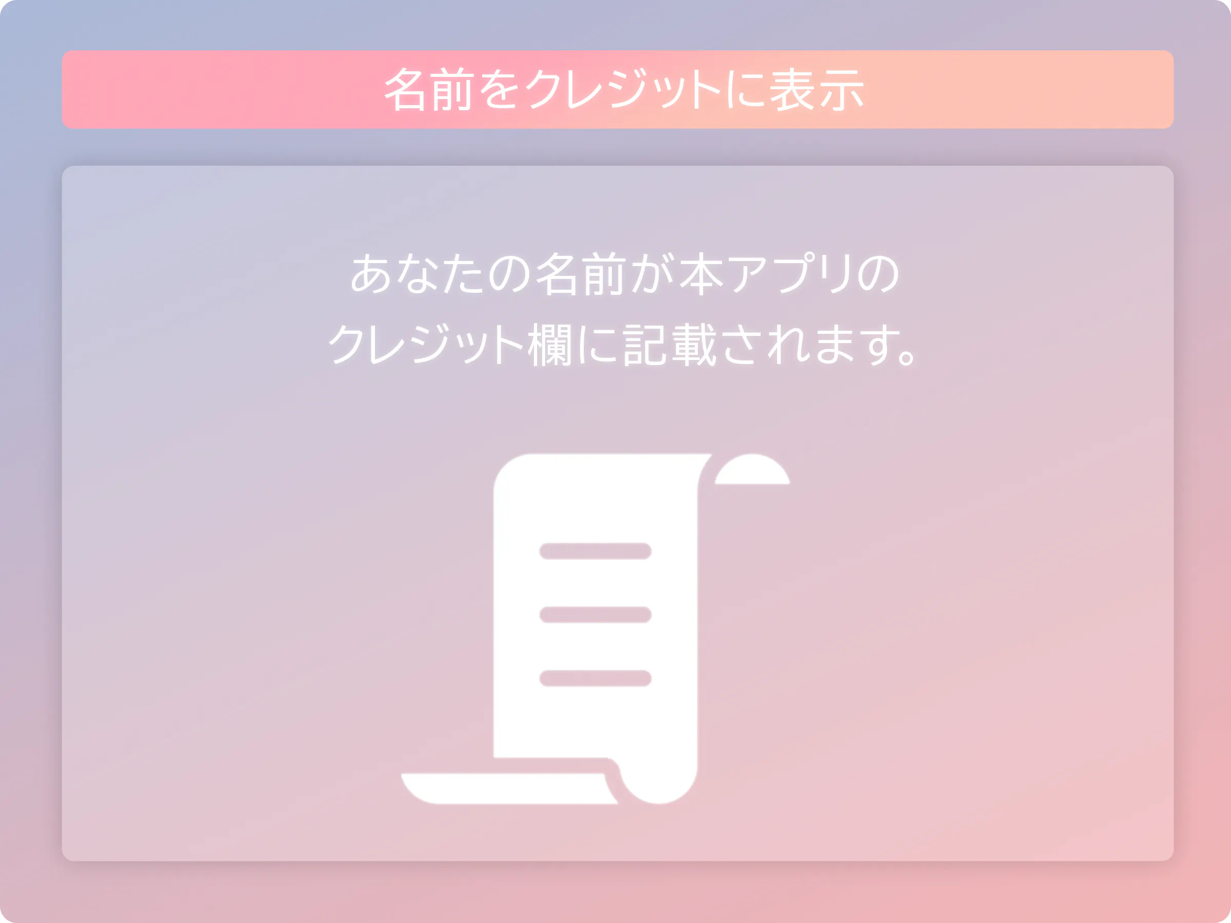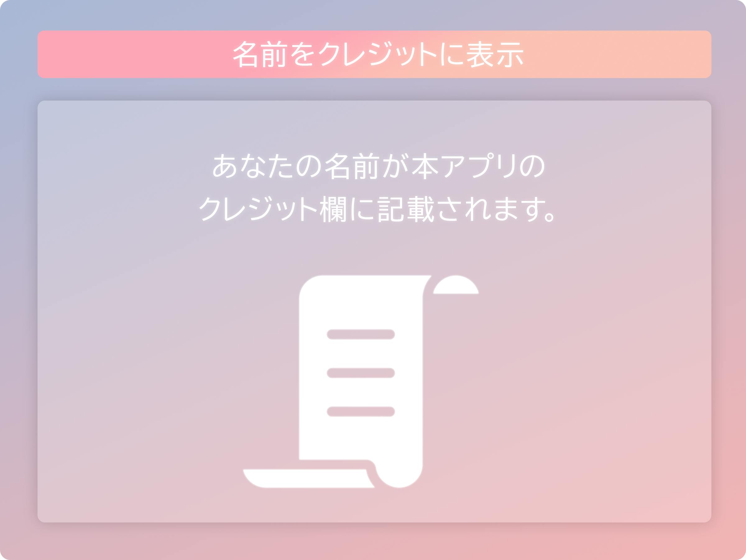 アプリ内のクレジット表記画面にて、お名前を掲載いたします。