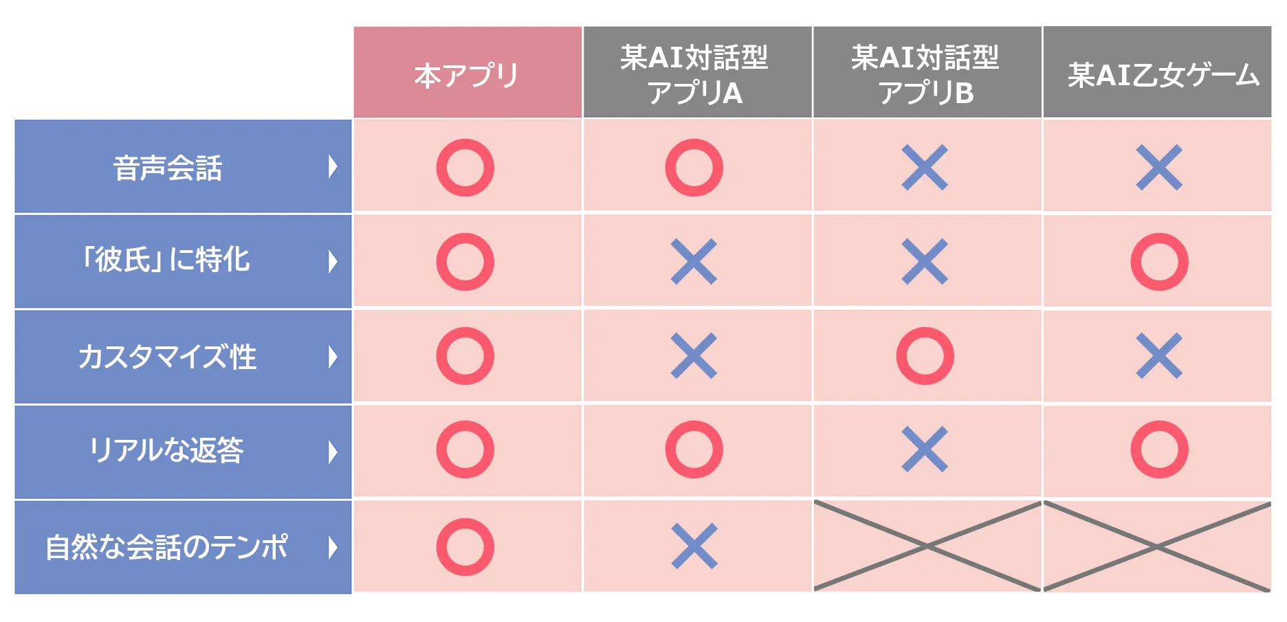 ただの会話相手ではなく、ユーザーにとって「理想の彼氏との自然な会話」を再現し、他のAI会話アプリにはない感情的なつながりやリアルさを提供します。