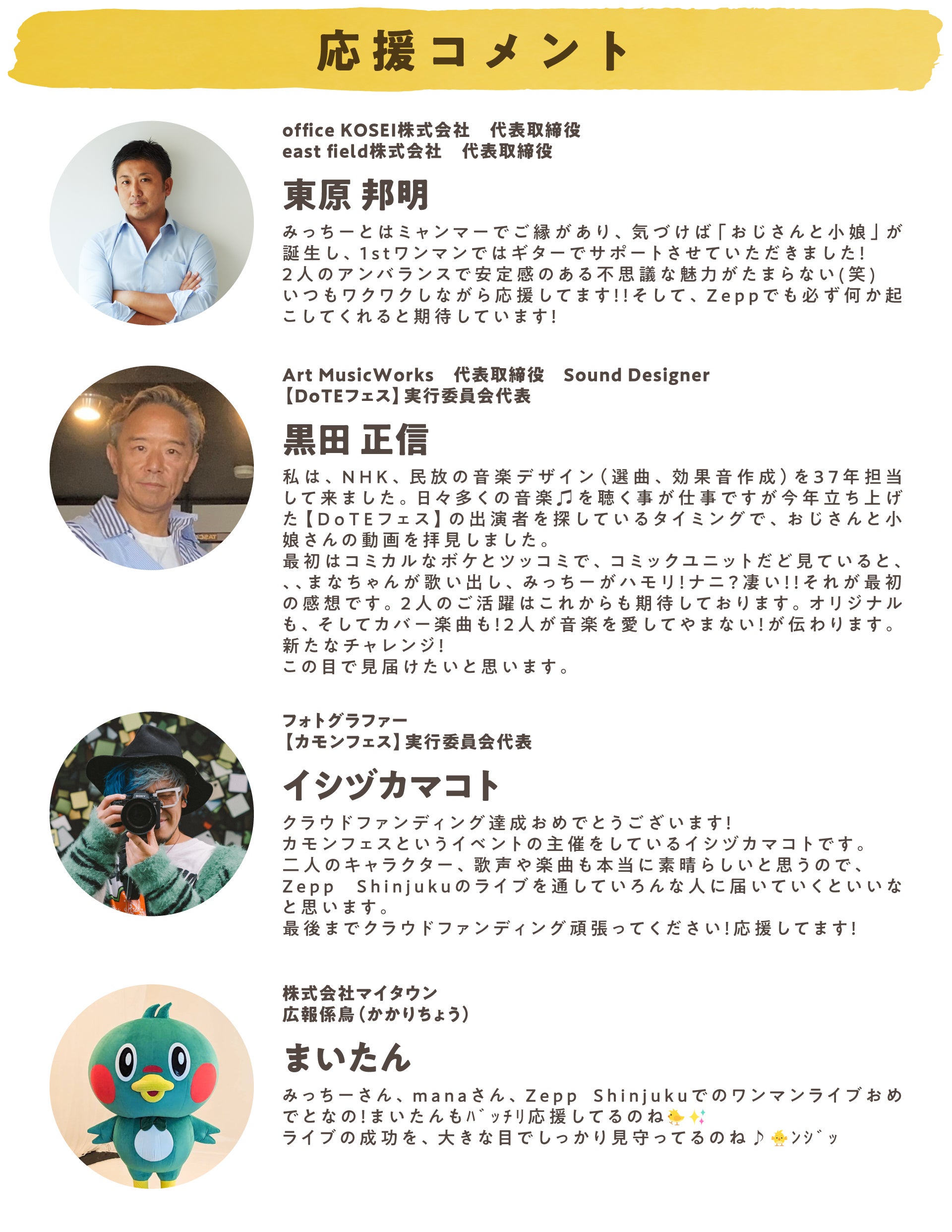 2025/01/01 23:20皆様こんばんは!おじさんと小娘のmanaと申します!まずは、2024年11月15日より、約一ヶ月半駆け抜けてきたこのクラウドファンディング。我々おじさんと小娘にとっては初めての挑戦。正直、クラウドファンディングというもの自体、ファンの皆様に受け入れてもらえるのか、理解してもらえるのか、本当にご支援を募れるのか、楽しんでもらえるのか、たくさんの不安と共にスタートしました。クラファンってなに?なんのために?どういうこと?と思っていた方もたくさんいると思います。私たちは、どうしてもZepp Shinjukuでのライブを成功させたい。そして、なにより、おじさんと小娘らしく、"みんなと一緒に"、"楽しく"、クラファンも、Zeppへの道のりも歩んでいきたい。そんな想いを汲み、未来の私たちへの期待も込め、ご支援してくださった方、本当にありがとうございます。何度もお伝えしていますが、正直、最初のゴール100万円が、厳しいのではないかという気持ちもありました。まさか、まさか初日で達成させていただけるだなんて、思ってもみませんでした。これは本当に、ファンである"親戚"の皆様のお力で、圧倒されてしまいました。親戚の皆様のこと、そして私たち自身のことを、信じられていなかったなと、反省すらしました。そして、掲げたセカンドゴール。これも、え?目標達成したのに次??図々しくない??と思われないかと心配をしていましたが、そんな心配をすぐに吹き飛ばしてくださる、皆様の応援と拡散の嵐。本当に本当に涙が出るほど嬉しかったです。次なる目標を掲げたからには達成したい。その目標に向かって支援してくださるみなさんのためにも、無駄にせず達成したい。その思いで、2024年最後の最後まで、走り抜けました。結果、少しのエンタメ要素としての、私とみっちーの対決もまさかの引き分け。そしてセカンドゴールも終了1時間前に達成。うまく言葉にできないのが申し訳ないですが、この言葉につきます。本当にありがとうございます。元々おじさんと小娘を応援してくださっていた方。このクラファン期間に出会ってくださった方。チームおじこむを応援するが故に応援してくださった方。スポンサーとして支援してくださった方。もれなく全員。ありがとうございます。セカンドゴールを達成した喜びはもちろん、嬉しかったのは、支援してくださった皆様が、リターンを心から楽しんでくれたり、そこから喜びや、ワクワクを感じていてくれたこと。私たちは、皆様に支えられていること、改めて強く感じました。これから先は、私たちがZepp Shinjukuでのワンマンライブを大成功させることそれが一番の恩返しだと思っています。音楽で、楽しい空間で、精一杯皆様に感謝を伝え続けていきます。本当に1ヶ月半、ありがとうございました。さぁ、2025年4月28日。おじさんと小娘 Zepp Shinjuku ワンマンライブ『おじこむ戦隊!Zepp 揺らすンジャー』Zeppみんなで揺らすぞぉぉぉおおおおおおおお!!!!! もっと見る300万円突破ありがとうございます!!!セカンドゴールまであと90万円!!