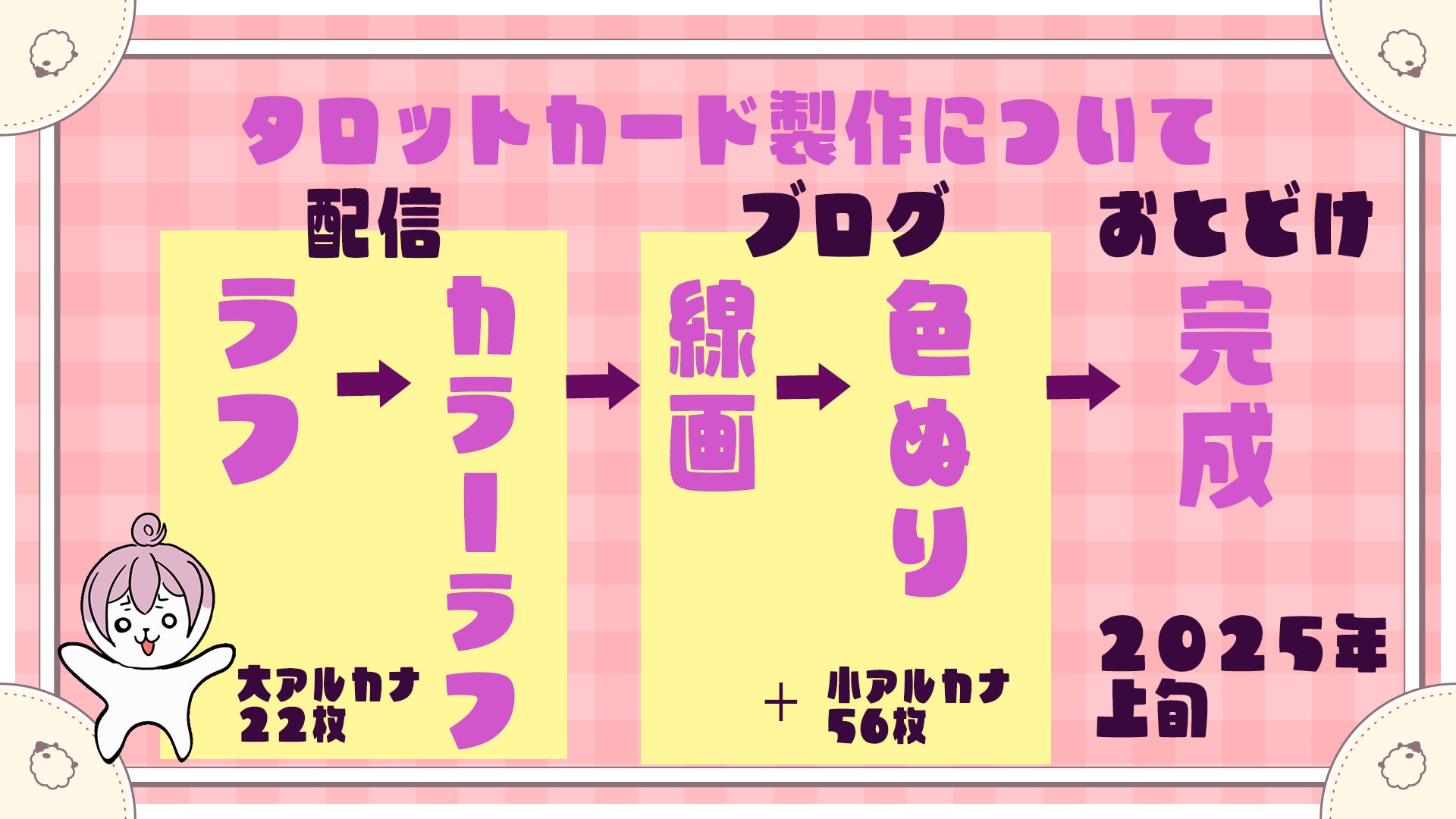 みなさんこんばんは!この度はタロットカード製作のプロジェクトにご支援いただきありがとうございます!タロットカード製作のおおまかな最新スケジュールをお知らせします!配信では大アルカナ22枚のラフとカラーラフを実施します!完成後このカードは配信で使用するので、すんばらしいみなさまのアイデアも盛り込んだ可愛いタロットカードを作りたいです!第一回目の限定配信は11/10 10時からとなります!アーカイブでのご視聴も可能です。よろしくお願いします!花宮ローズ