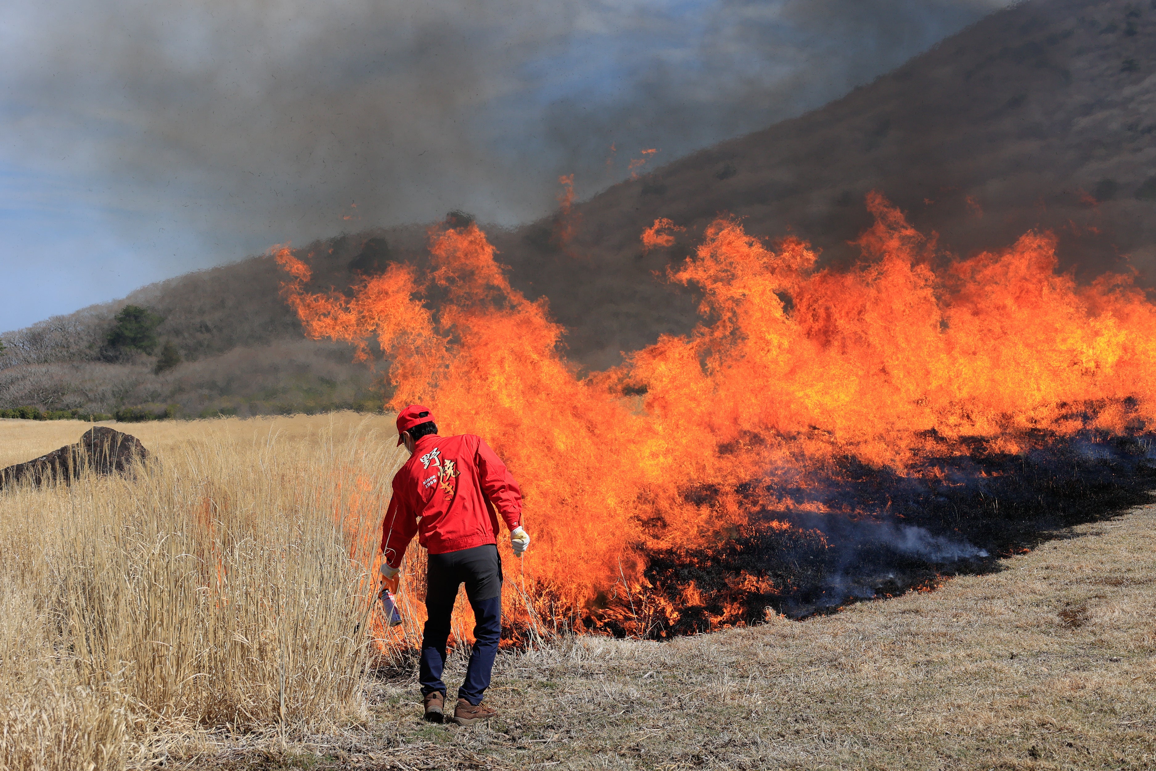 春の風物詩「本焼き」/草原の里「くじゅう坊ガツル湿原」(大分県竹田市)草原には、特殊で多様な生物が息づいています。草原が失われつつある今、その多くが「絶滅危惧種」と呼ばれるようになりました。草原生態系や希少野生生物の保全を進めるためには、山焼きや採草、放牧など、人の営みが欠かせません。草原を使った農業や文化を守ることが、草原に生きる生物を守ることに直結しているのです。