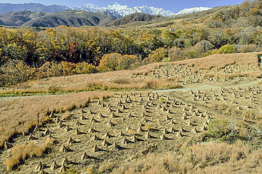 北アルプスが映える茅立てが広がる茅場/草原の里「小谷」(長野県小谷村)