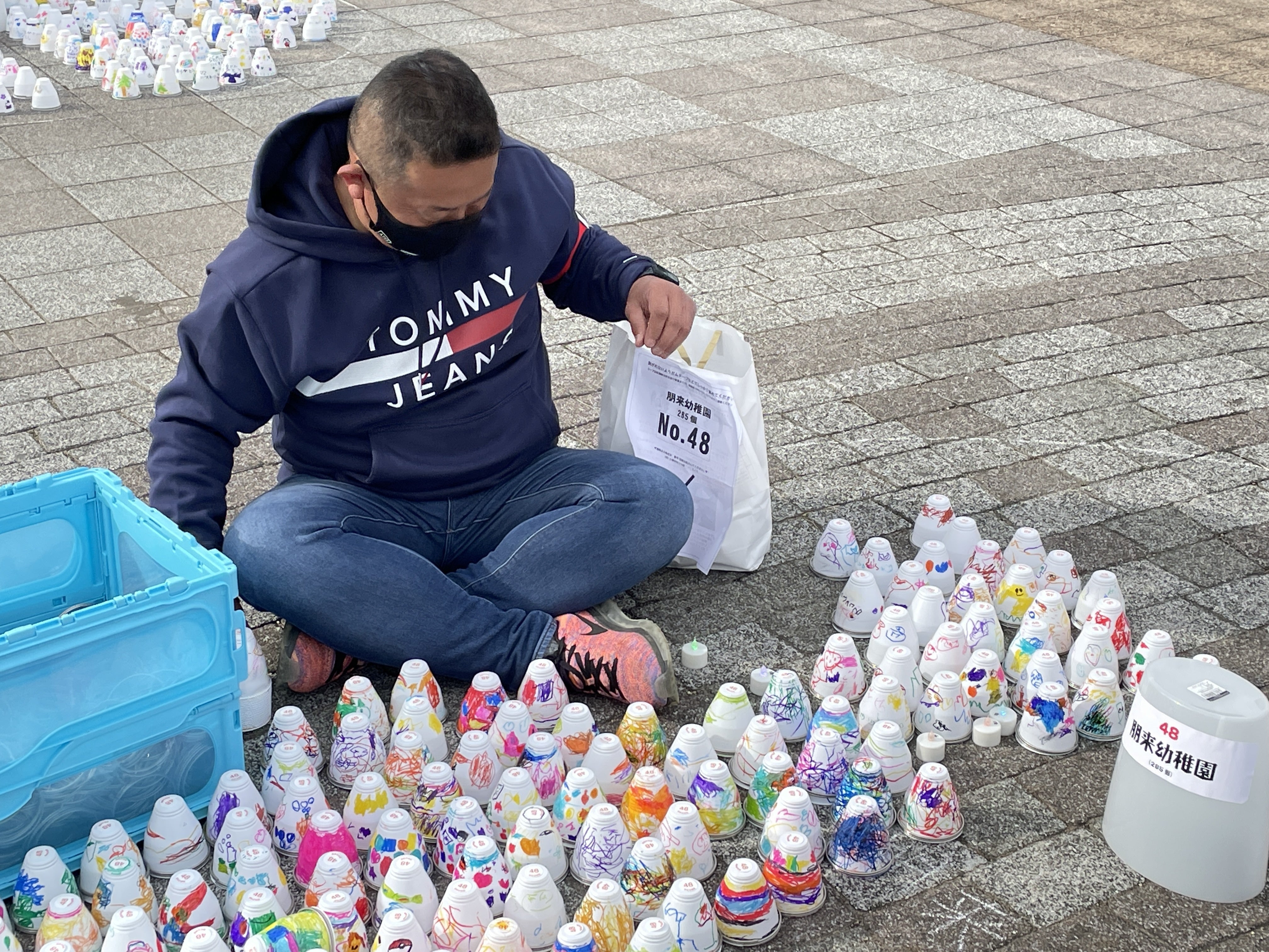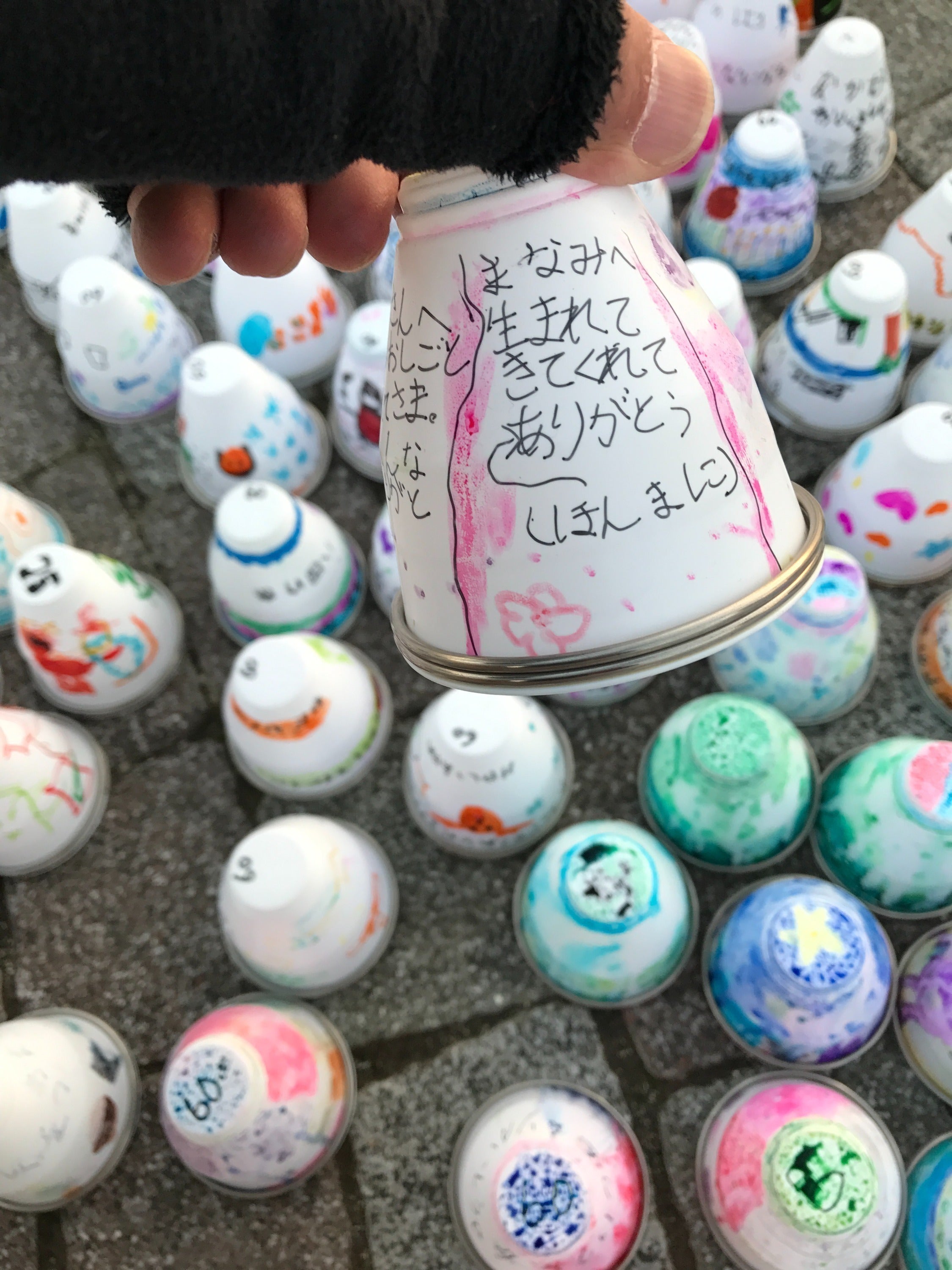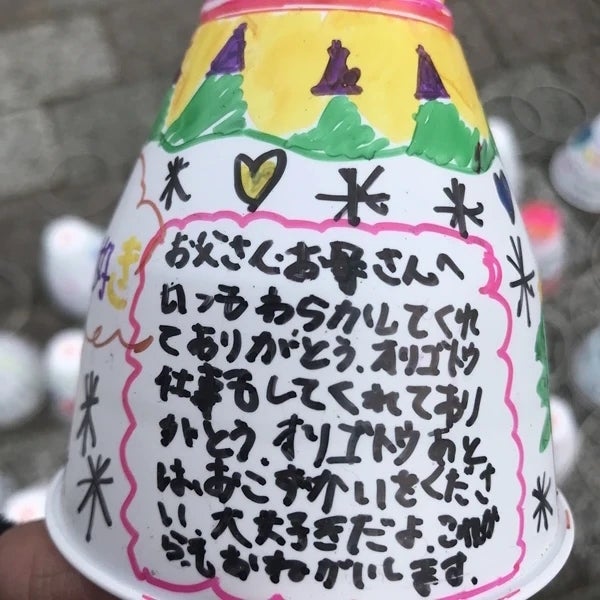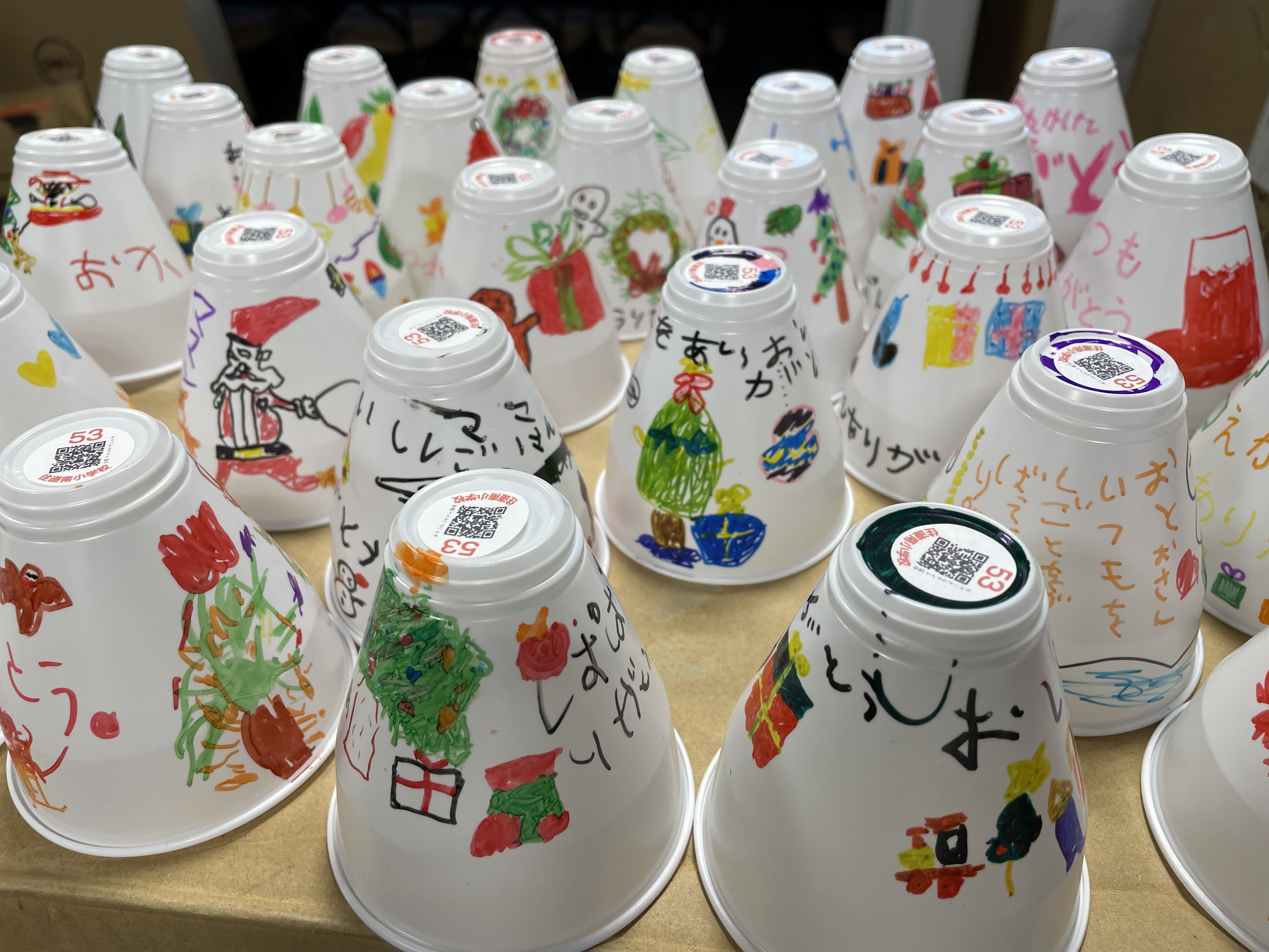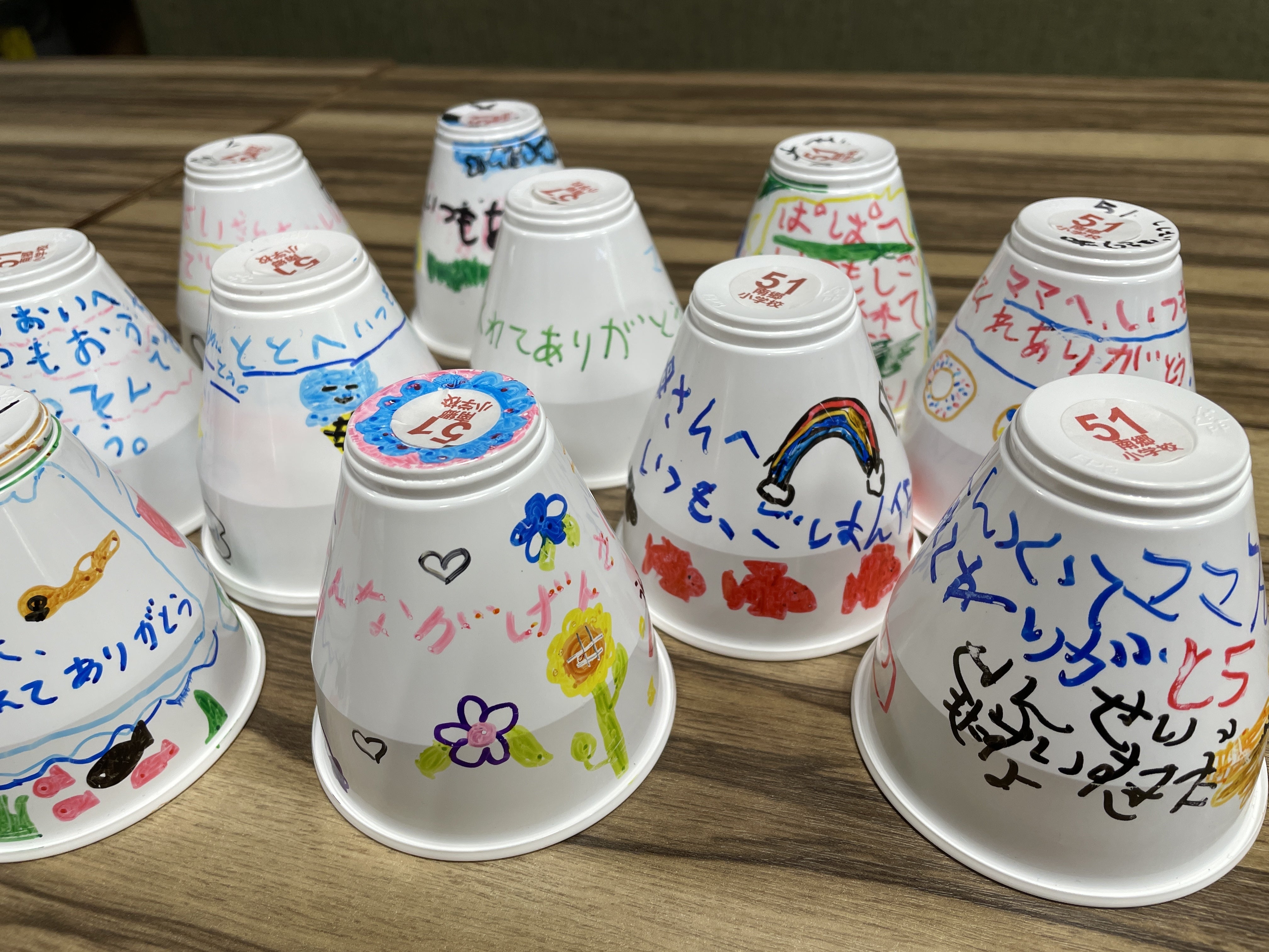 子どもたちは自分が描いたカップがみつかったら持ちかえって、家族や友だちに感謝の気持ちを伝えてみてください。きっとよろこばれるはずです。