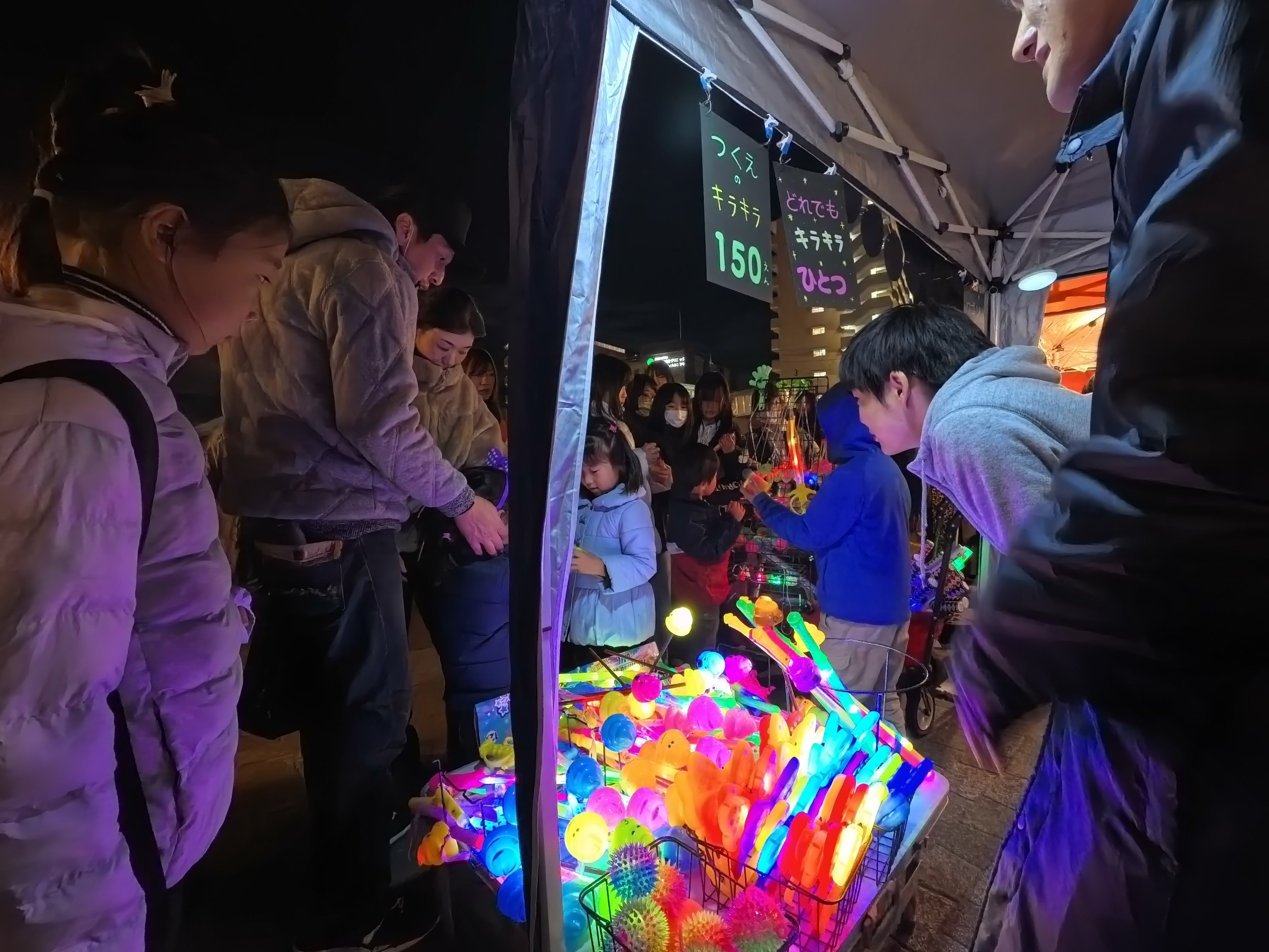 会場では子どもたちが誇らしげにメッセージカップを家族に見せたり、笑顔で一緒に写真に写ったり踊ったり。会場の周りには10店以上の夜店が立ち並び、寒い夜に心が温かくなるひと時になります。