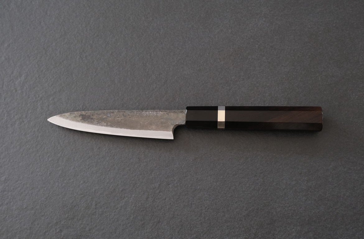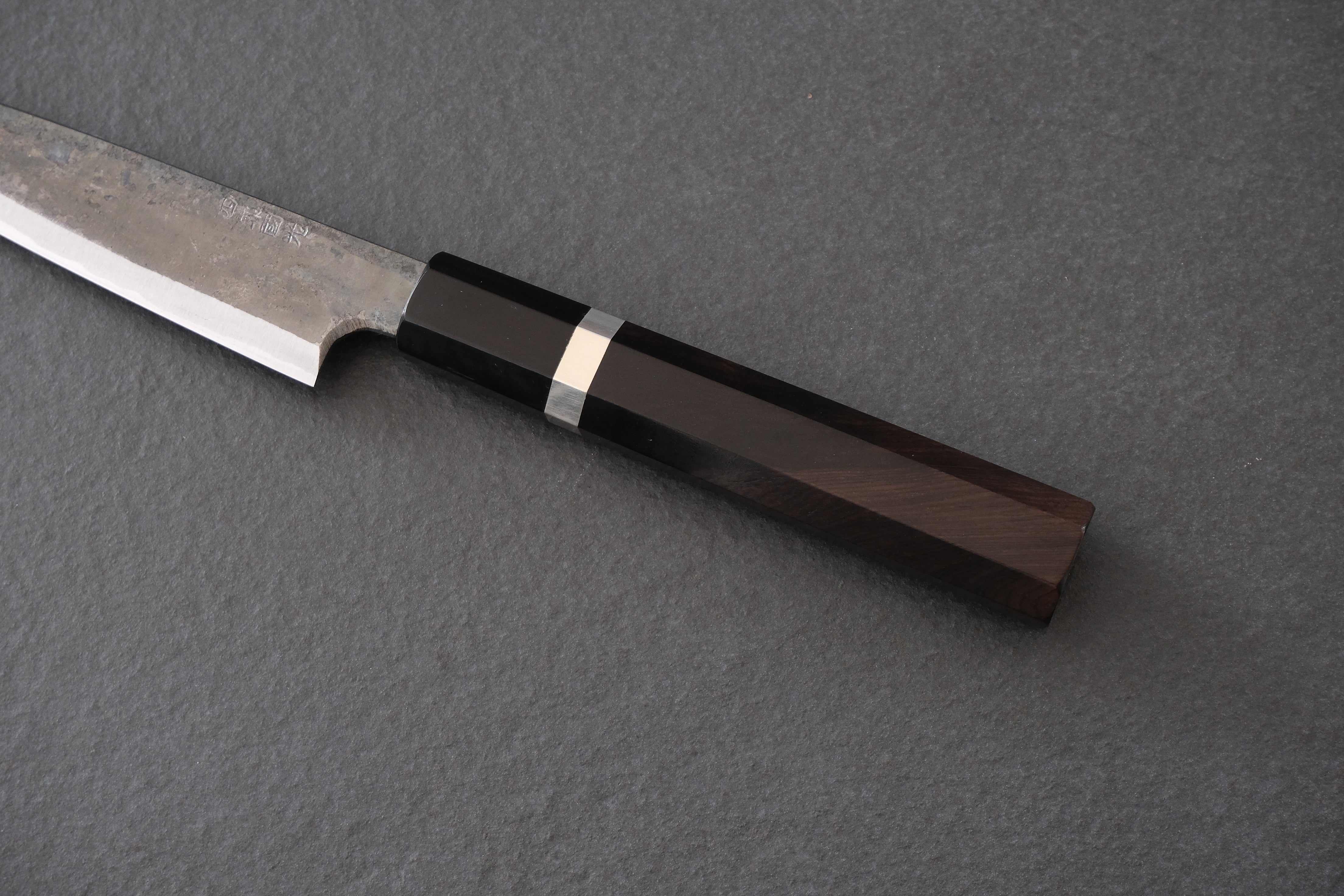 黒檀ハンドルのメリットはいろいろありますが、一番感じやすいのが包丁の重心が持った時手前にくることです。黒檀という木の素材が大変比重の重いものであるため、ほかの木の素材より重厚感があります。そのおかげで包丁の全体の重さのバランスが手の方に近くなり、包丁で物を切る際に扱いやすくなります。黒檀は銘木になりますので高価なものですが、扱いやすくなるのと高級感もあります。