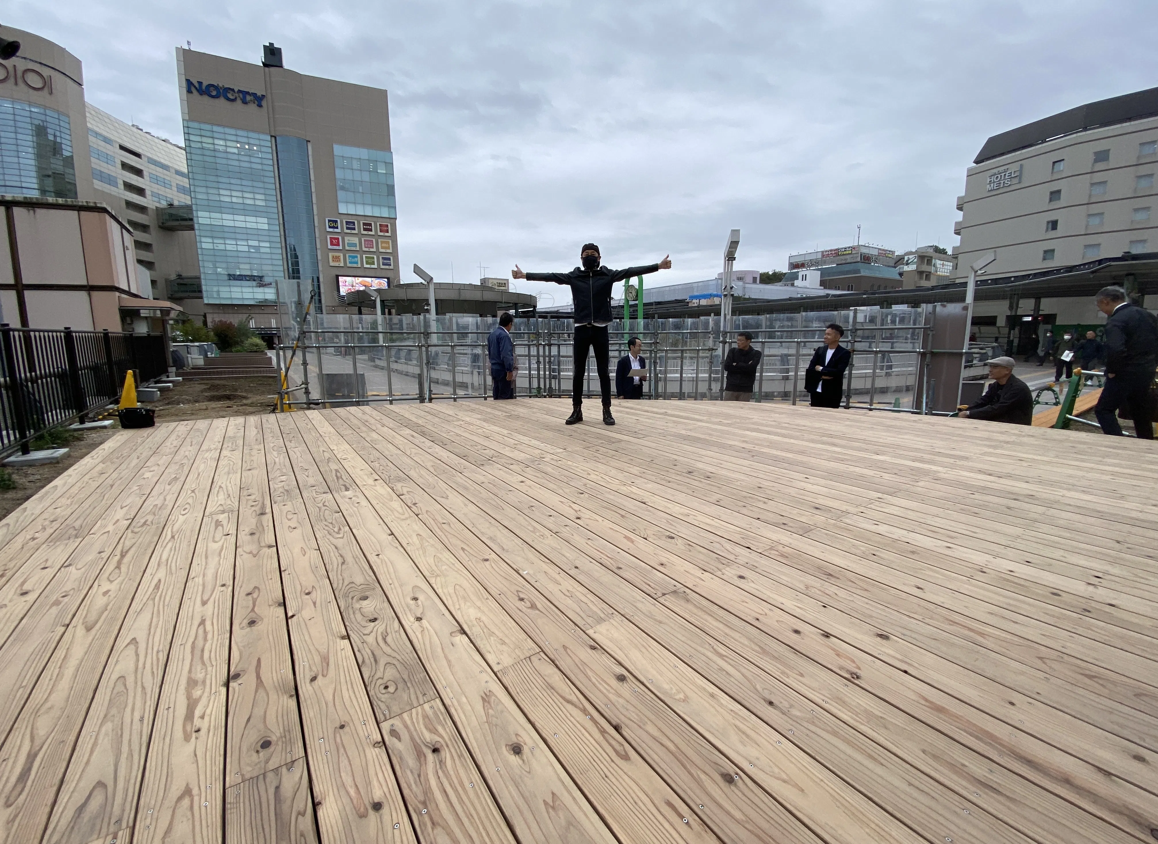木製の常設ステージを設置する溝口駅前キラリデッキ