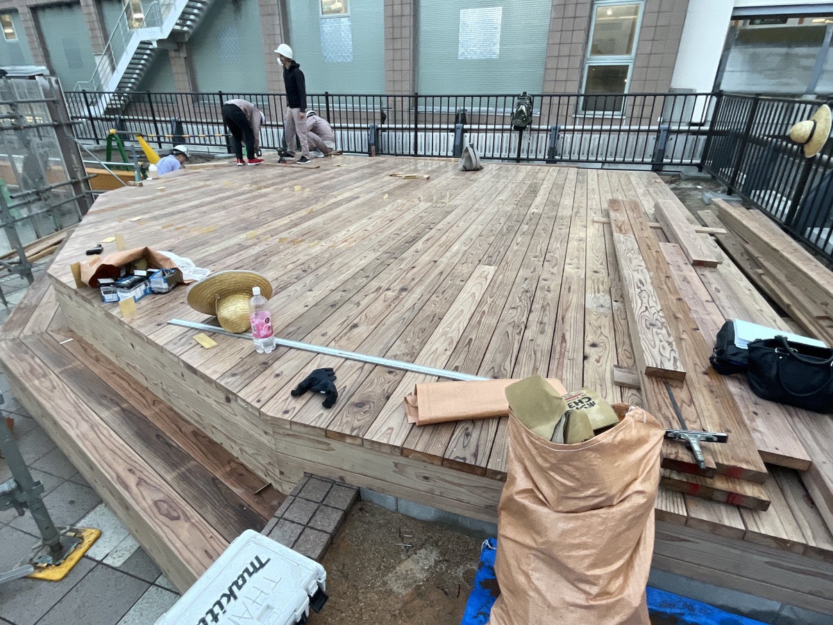 溝の口キラリデッキ木製ステージいよいよ完成です!(このあと植栽が入ります。)パフォーマンスの場としてそして普段は憩いのスペースとして。まずはここに立ってみてください。使い方はみんなで考えましょう!笑顔があふれる素敵な場所になる様にね。p(^_^)q