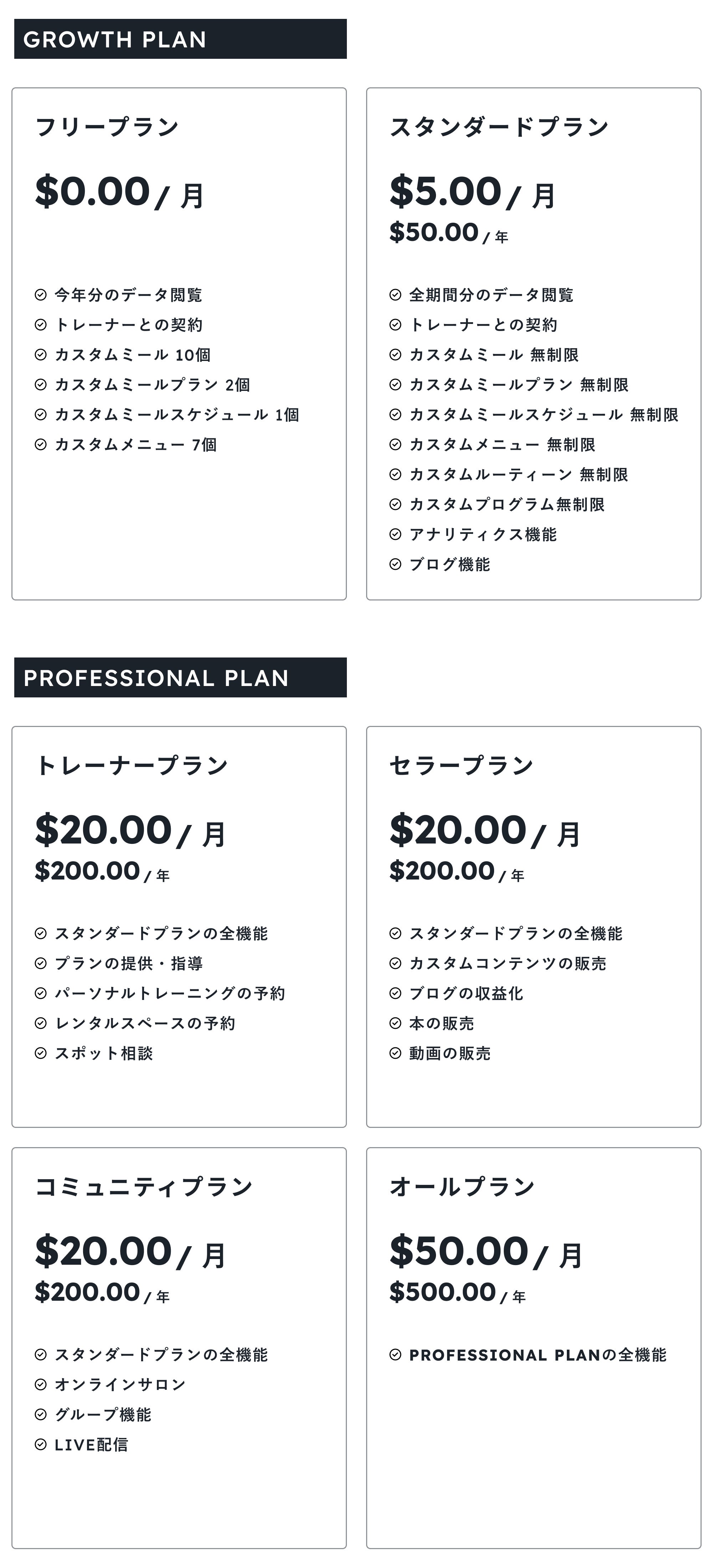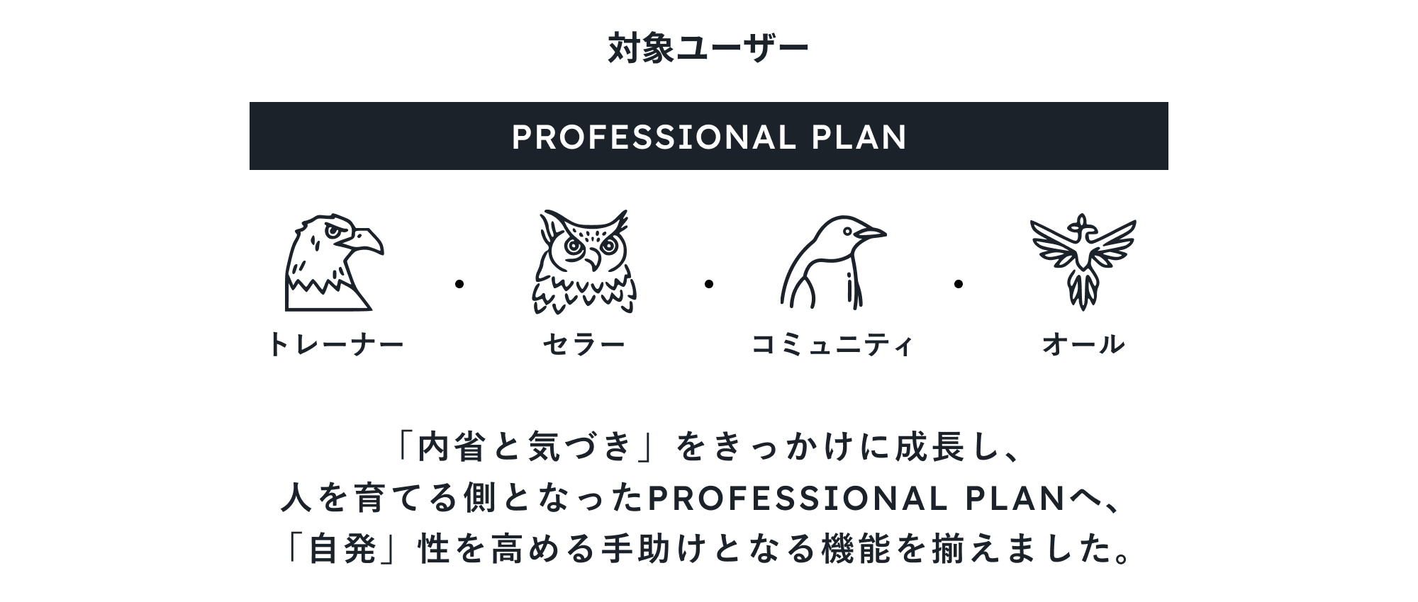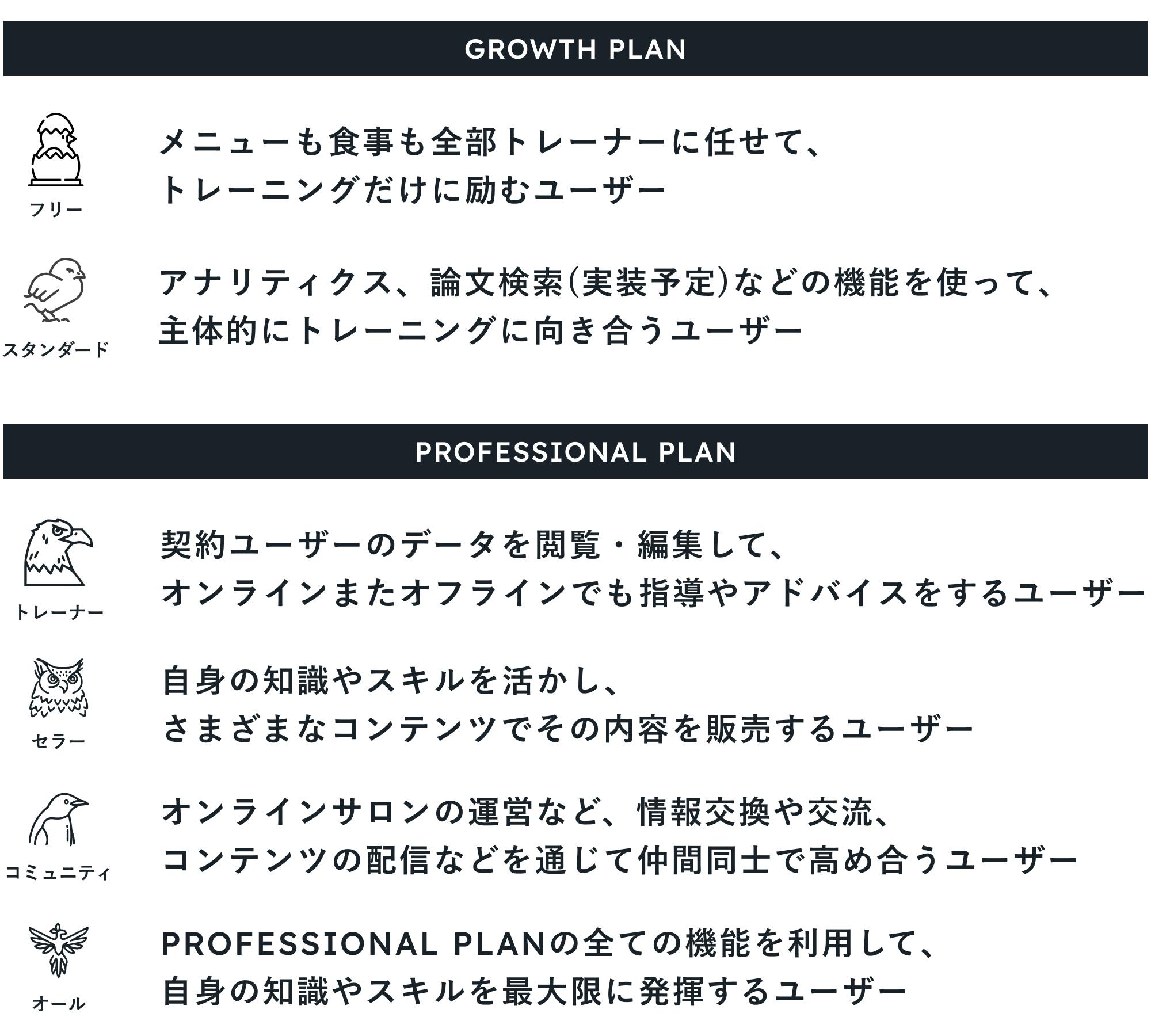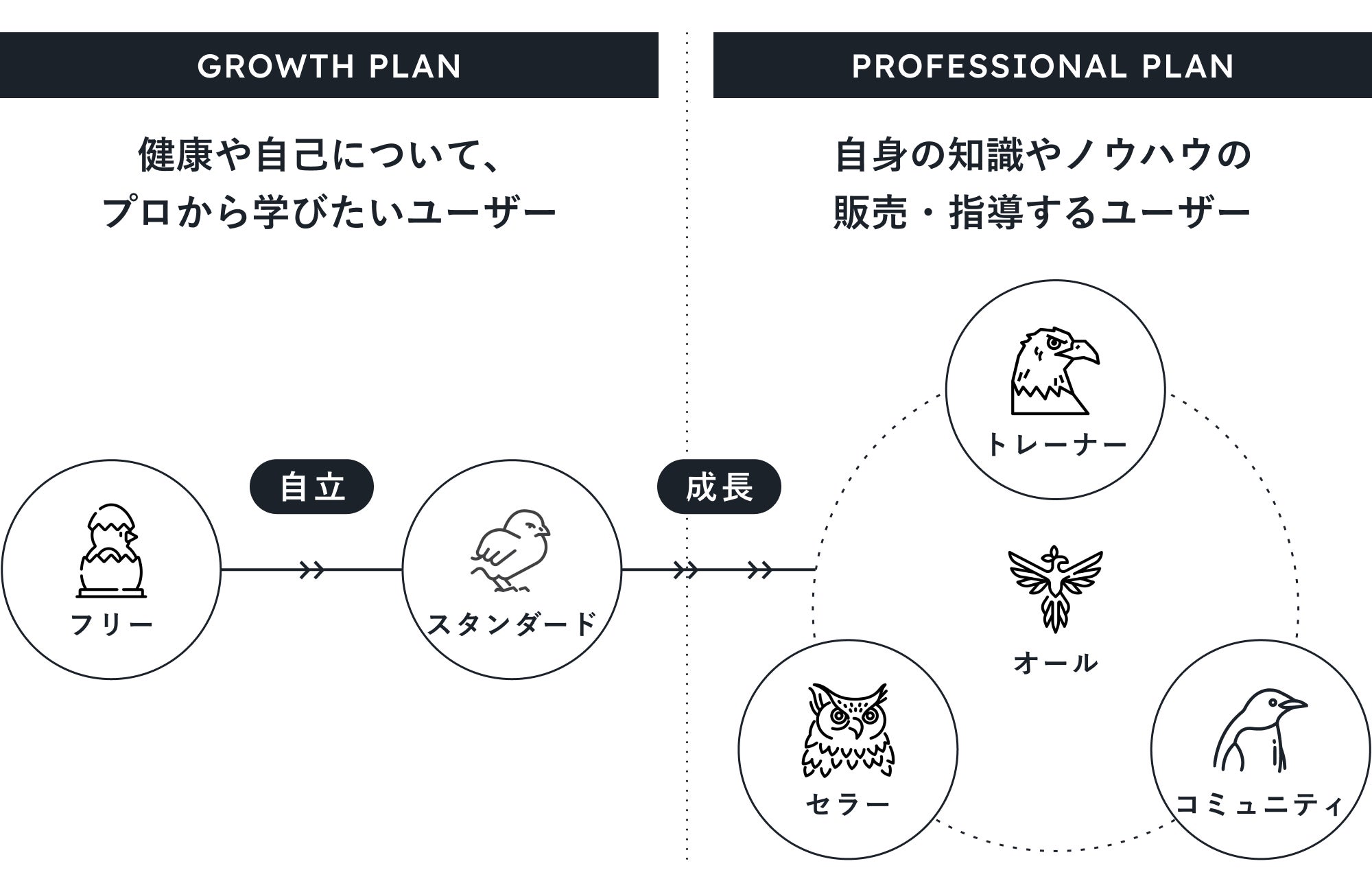 健康や自己について、学びたいユーザーのための 【GROWTH PLAN】と、教えたいユーザーのための 【PROFESSIONAL PLAN】です。