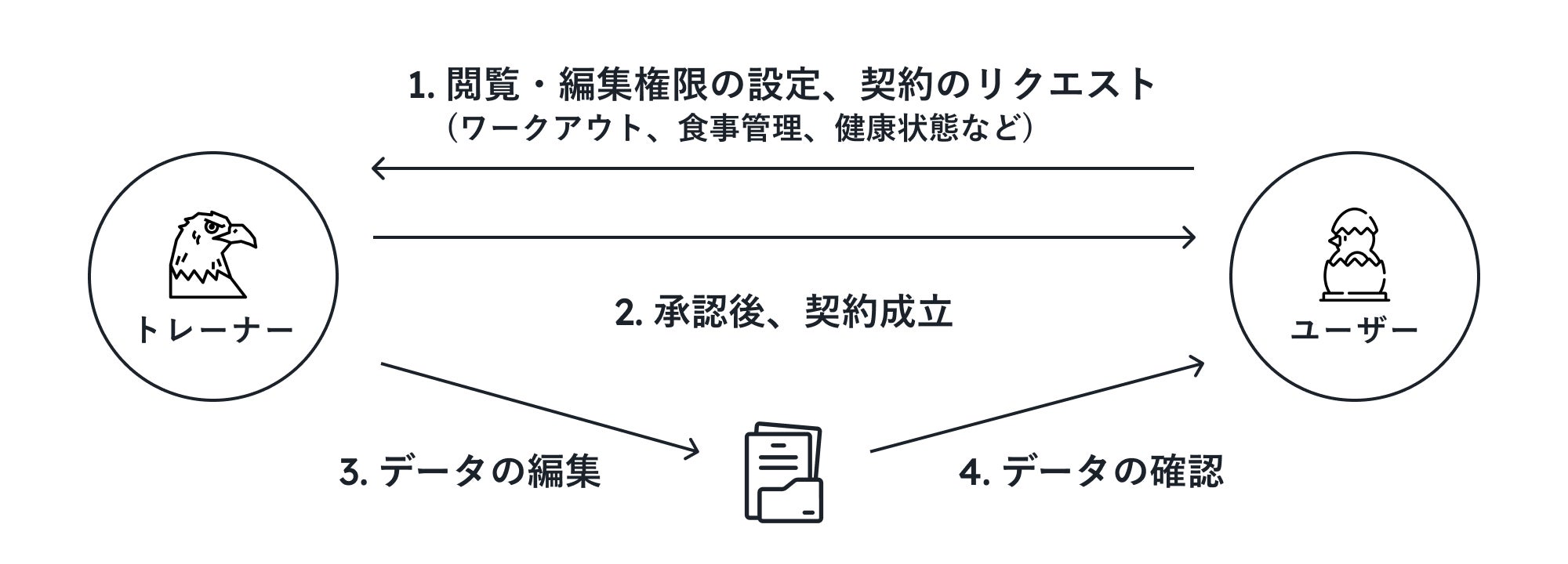 契約が成立したトレーナーはユーザーのデータのアクセス・編集が可能となるため、ひとりひとりに合わせたメニューをカスタマイズすることができ、またそれらはリアルタイムで反映されます。