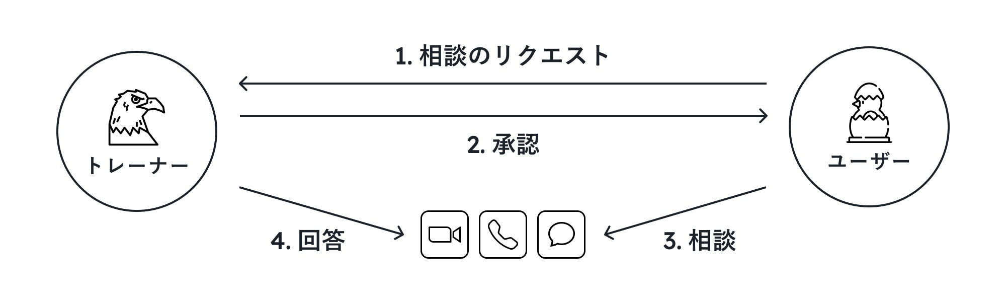 トレーナーは1回の相談の時間と金額を設定し、チャットやビデオ通話を通じてユーザーからの相談に受けられる機能です。