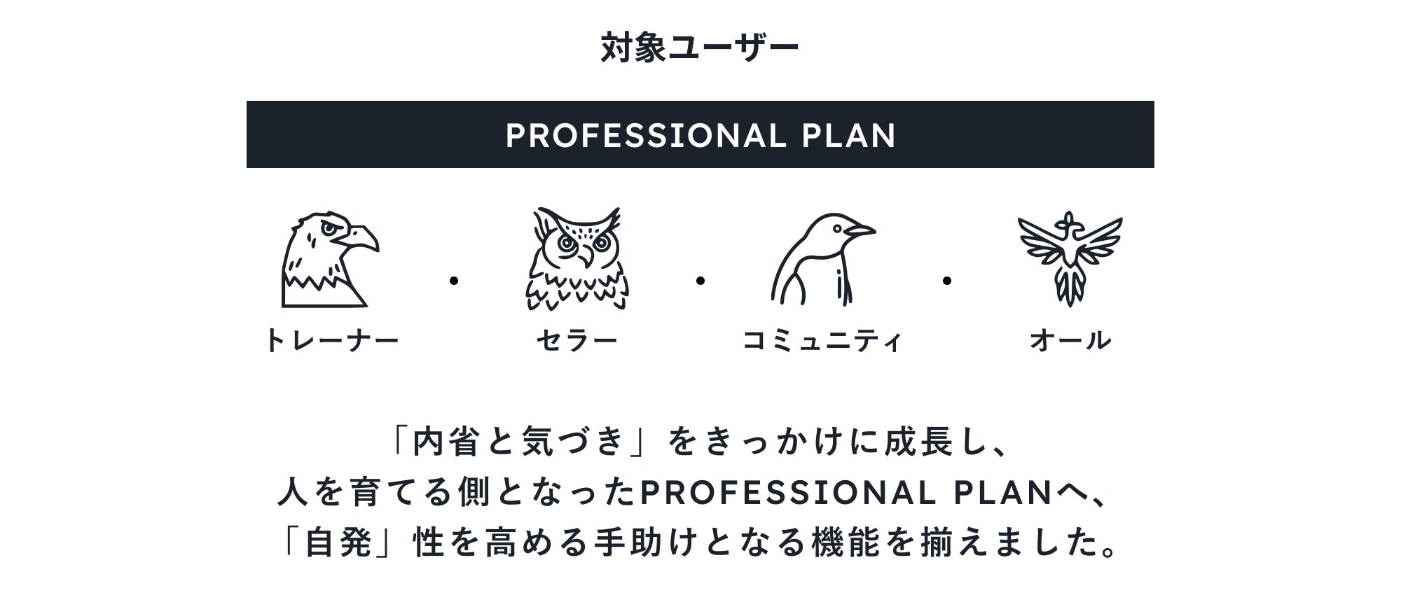 【PROFESSIONAL PLAN】の中には、[ トレーナープラン ] [ セラープラン ] [ コミュニティープラン ] これらのプランを全て内包した [ オールプラン ] があります。