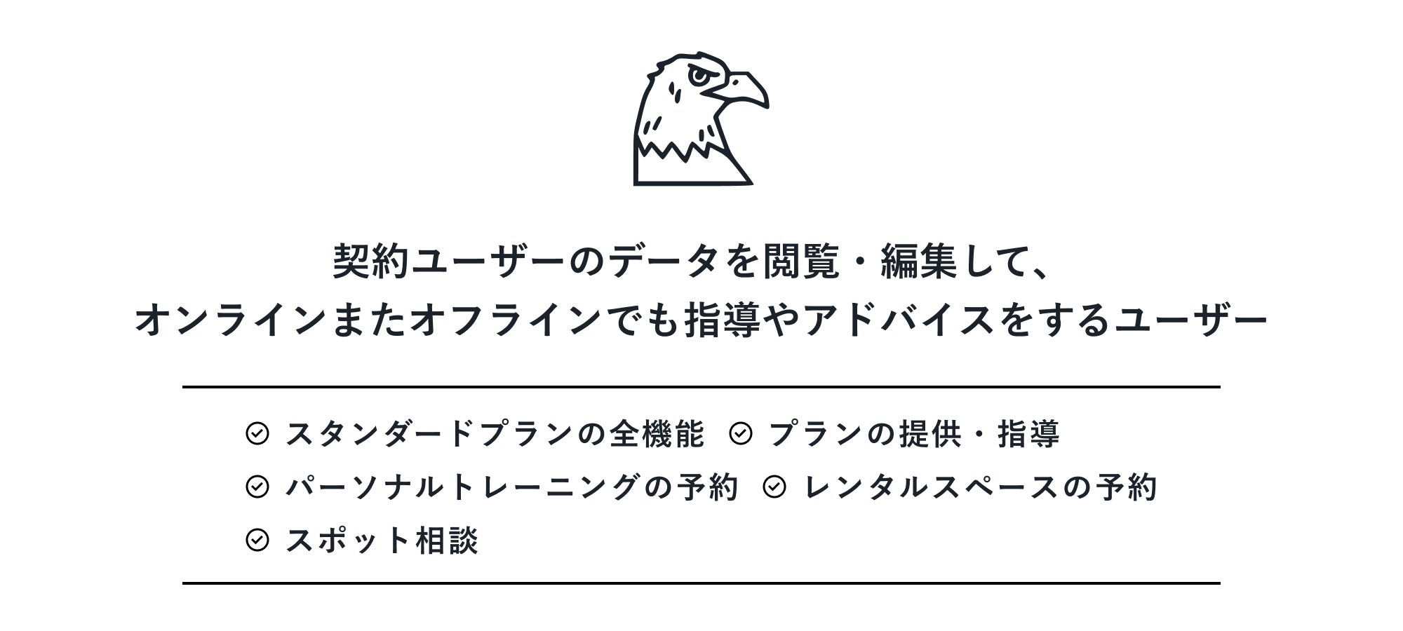 トレーナーが作成したサブスク制のプランに加入することで、トレーナーからリアルタイムの指導(データの操作)を受けることができます。指導の内容は、トレーニングメニュー・食事内容・栄養管理などがあります。