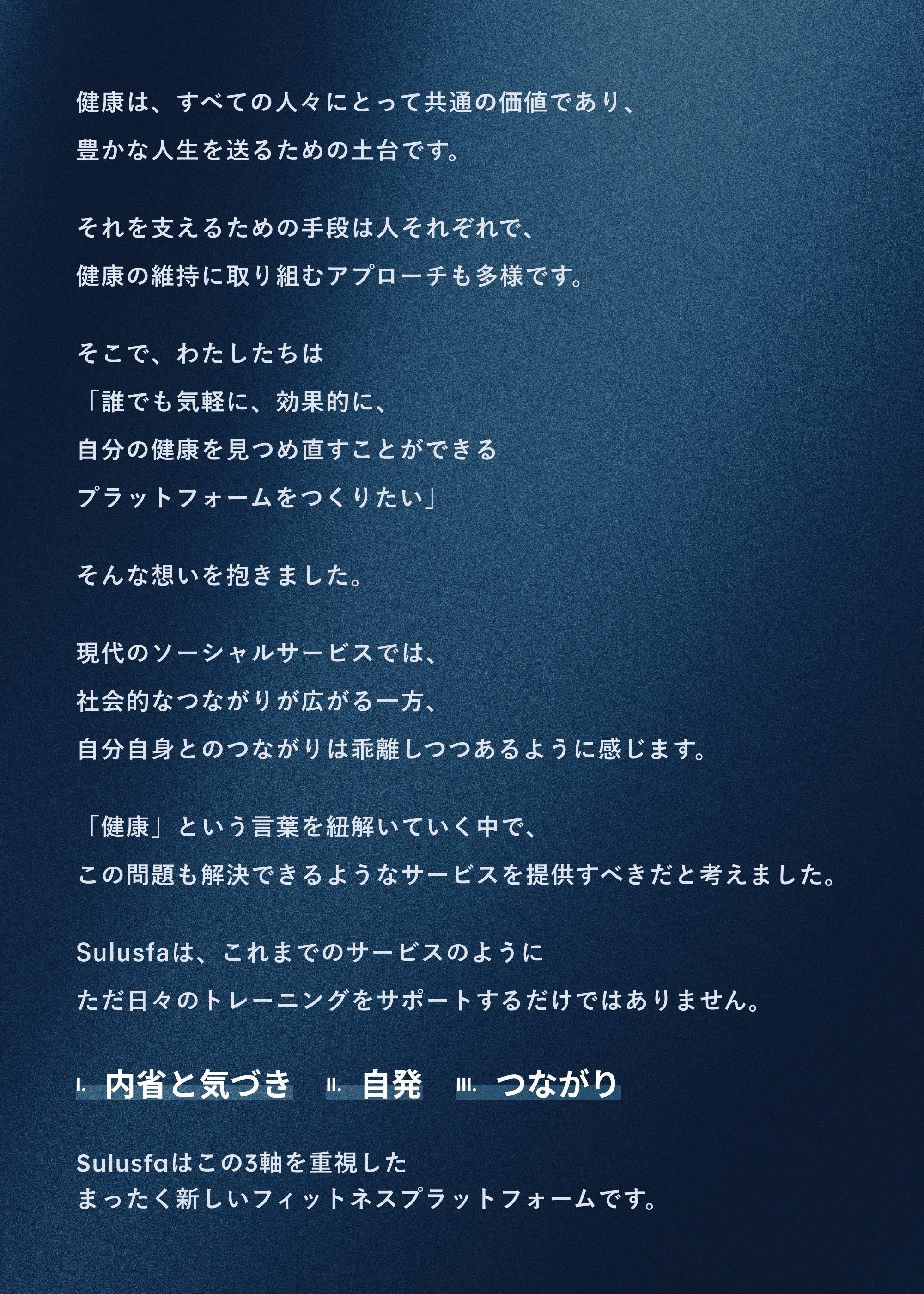 従来のサービスではつながりが広がる一方で、自己と離れていく(承認欲求由来の行動、意味もなく増えるスクリーンタイムなどの)問題があるのに対し、Sulusfaでは自己を深め、その先に世界とのつながりがあることを目標としています。