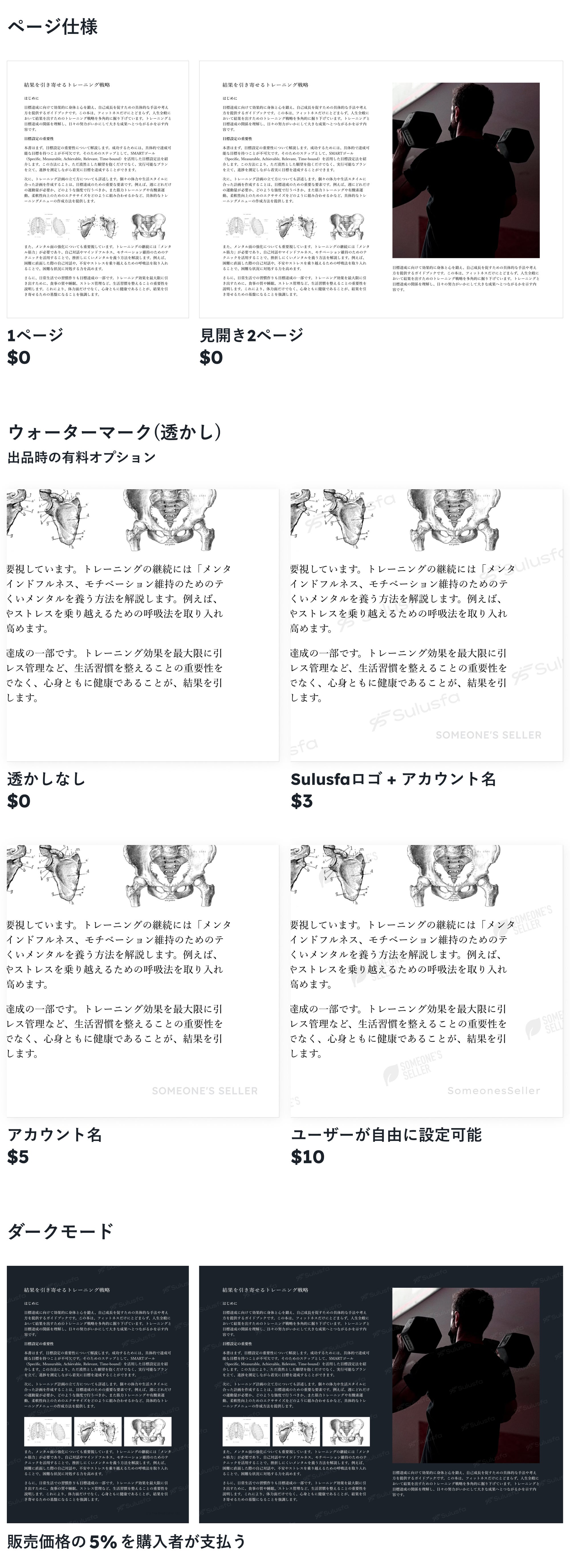 トレーニング方、ダイエットメニューのレシピ本など、さまざまな内容がSulusfa内だけでなく、PDF形式でオフラインでも読むことができます。また、転載防止のウォーターマークを入れることも可能です。