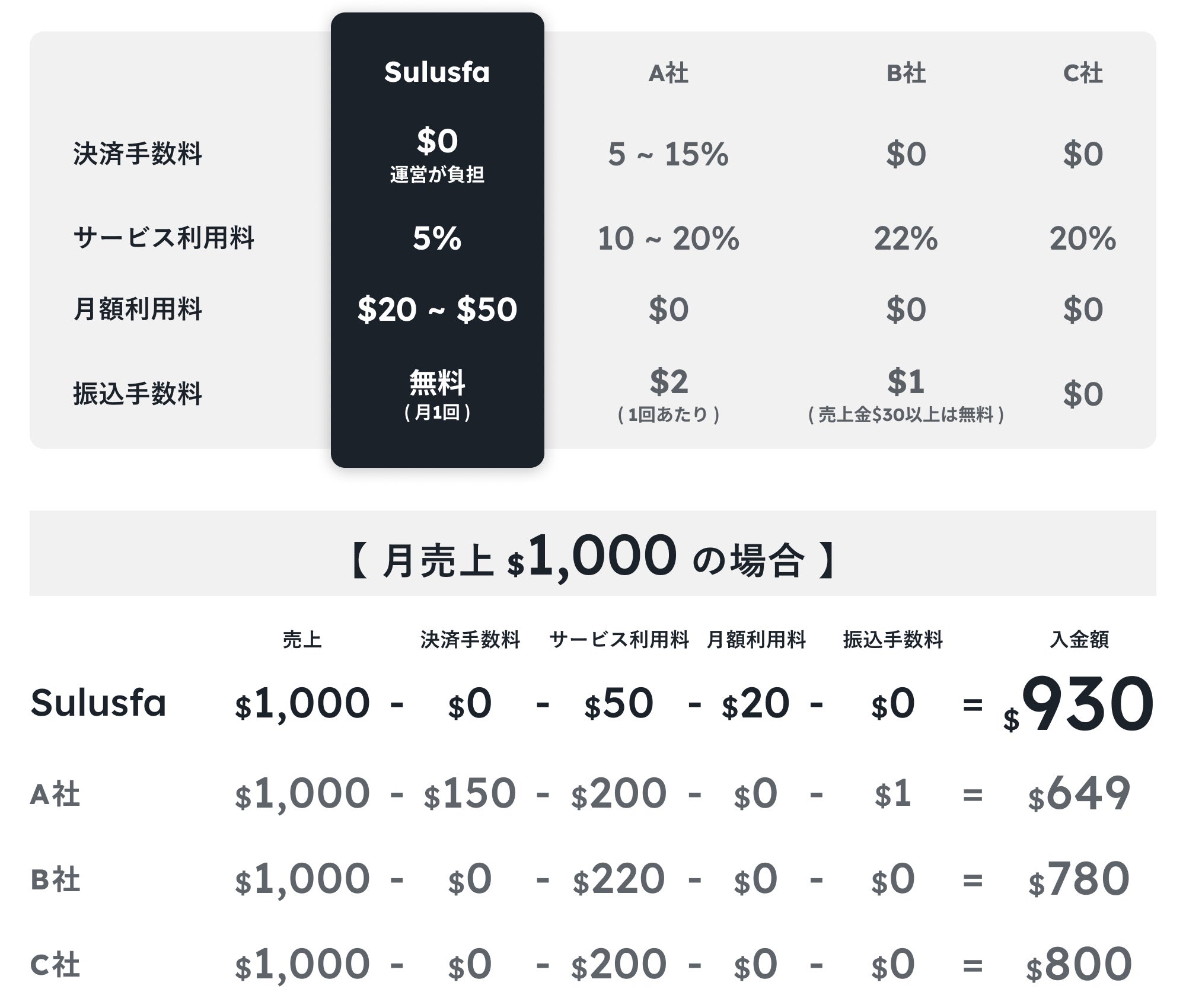 Sulusfaでは、トレーナーがより収入を得やすくするため、プラットフォームの利用料を低く抑えています。