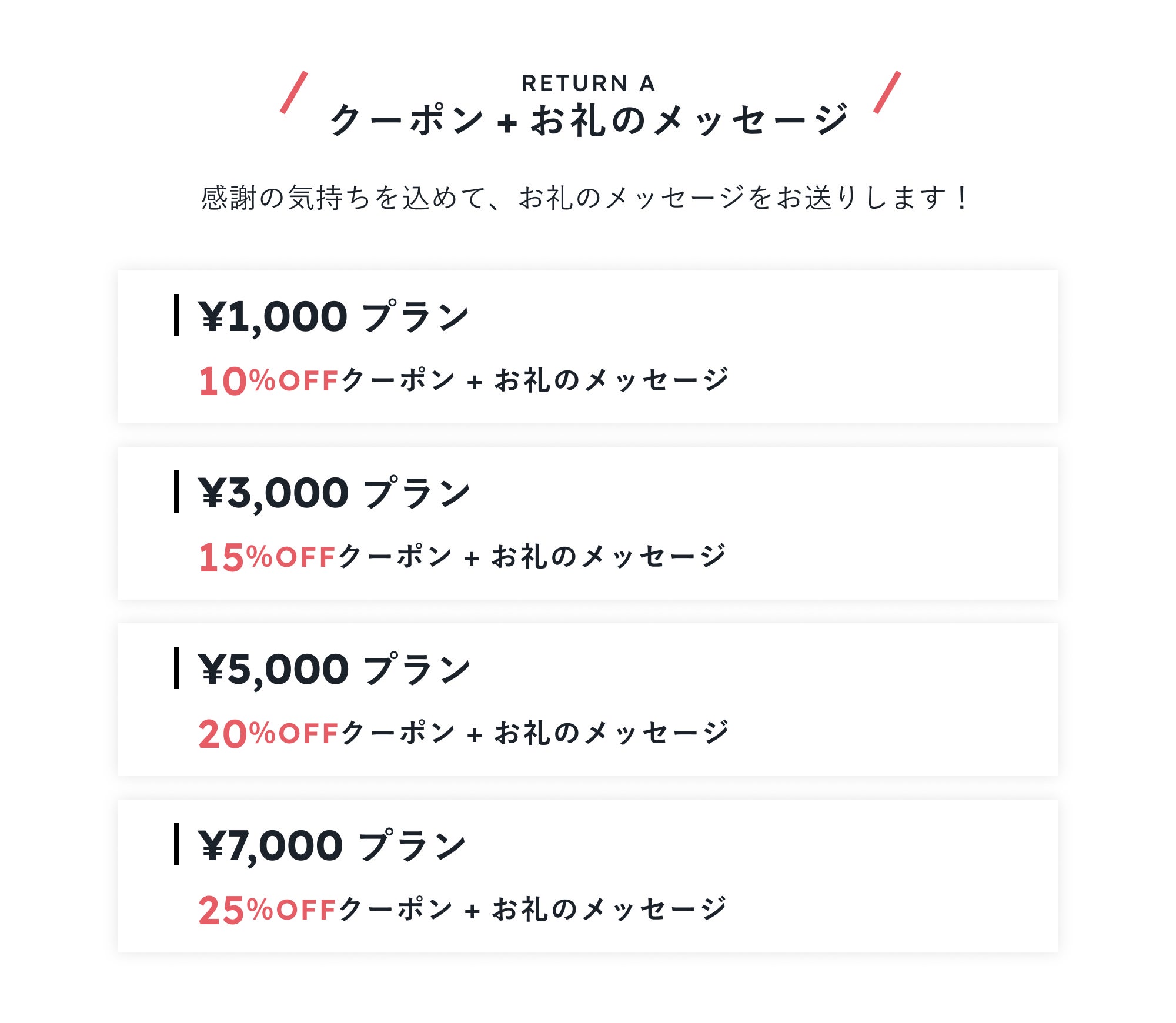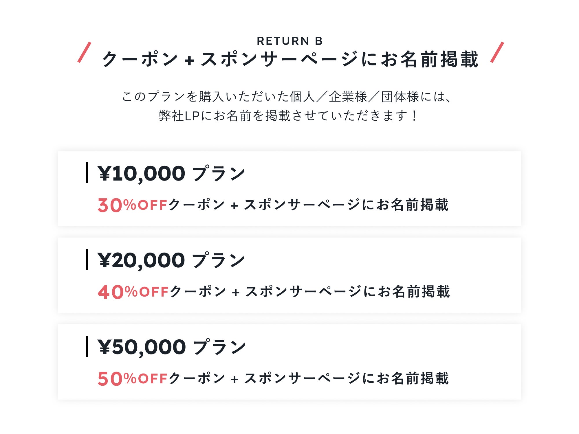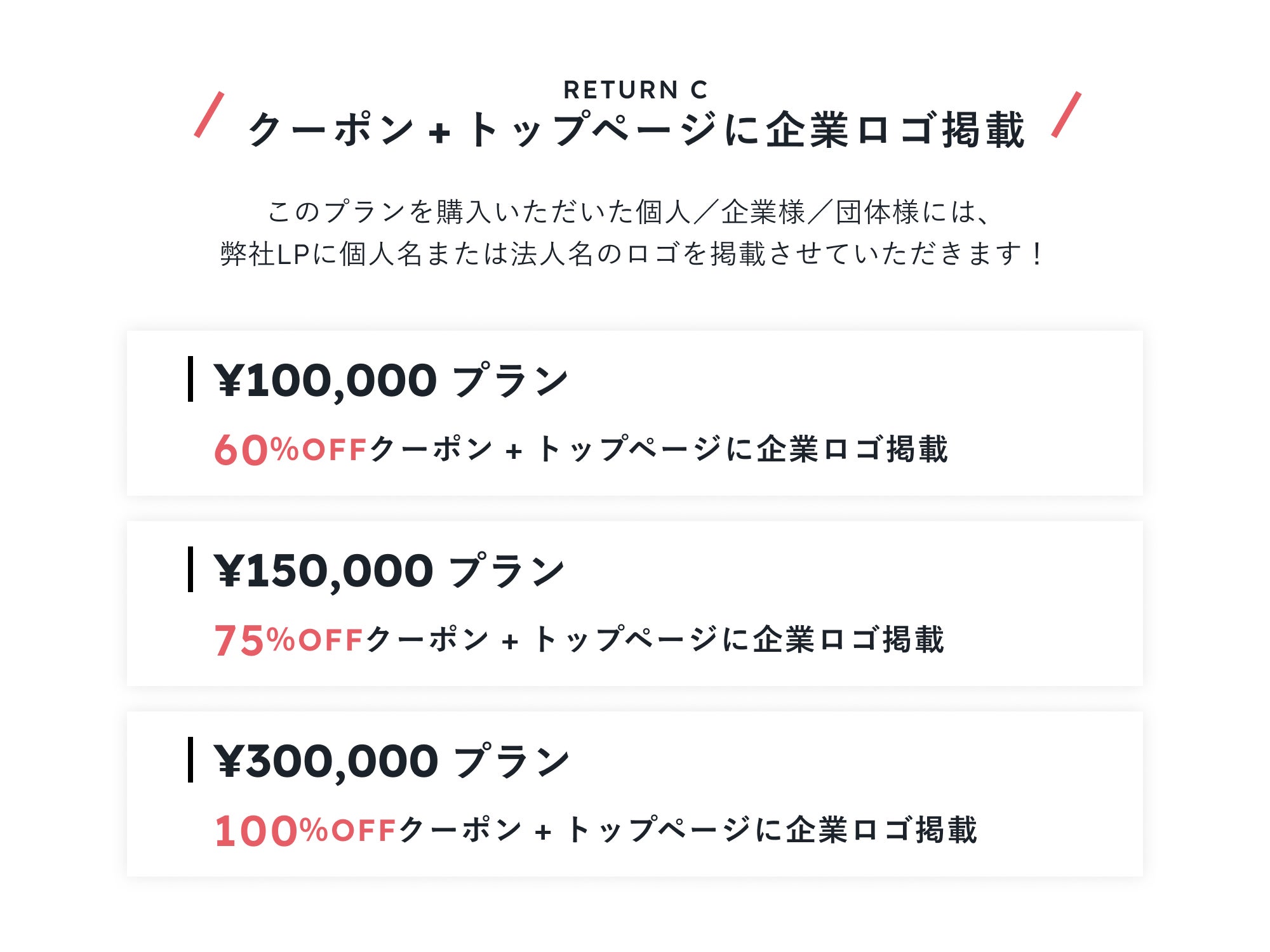 支援コースのリターンは 10% ~ 100%OFFのクーポン + αとなっております。