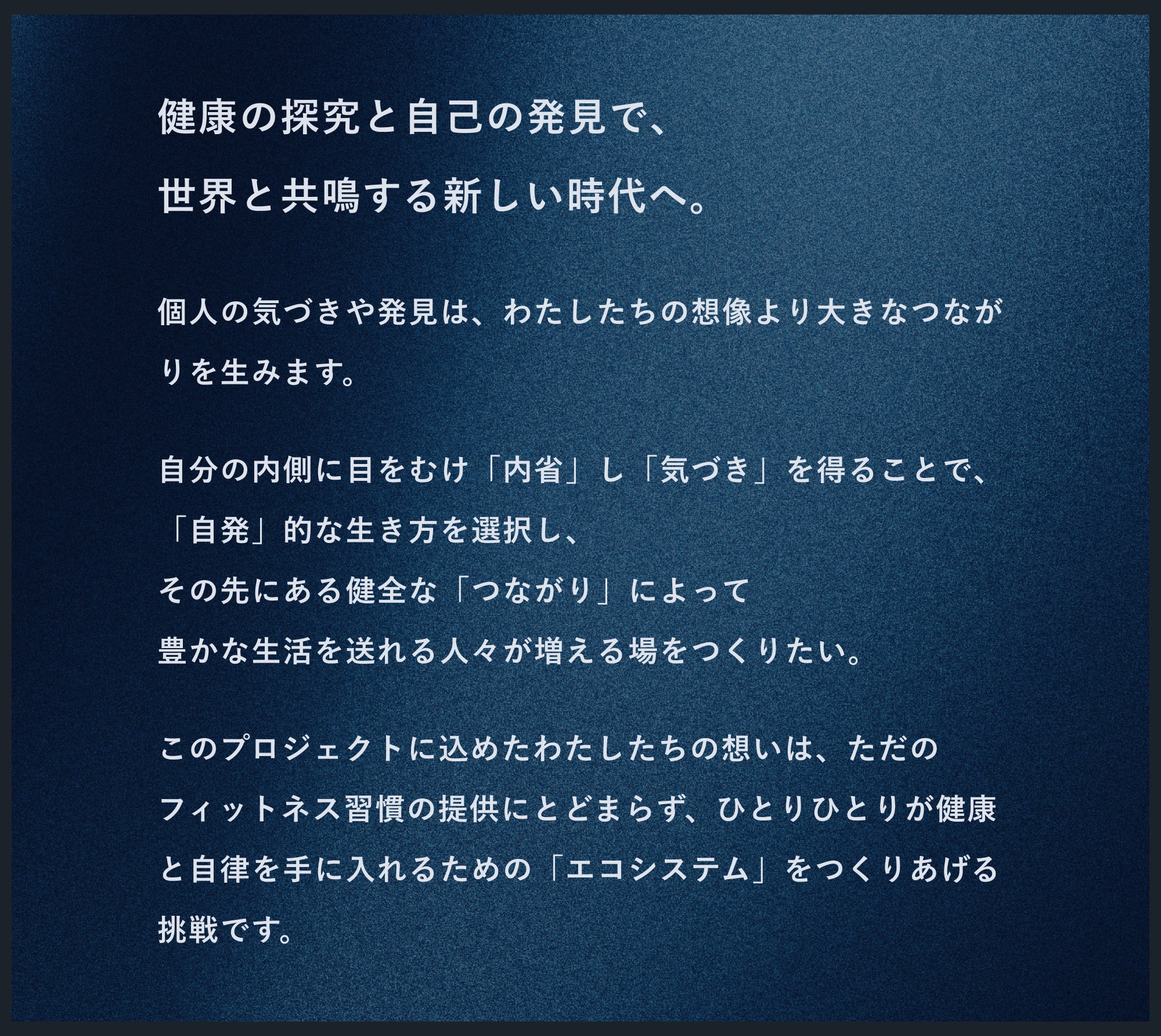 このプロジェクトに込めたわたしたちの願いは、ただのフィットネス習慣の提供にとどまらず、ひとりひとりが【健康と自律】を手に入れるためのツールを提供することです。