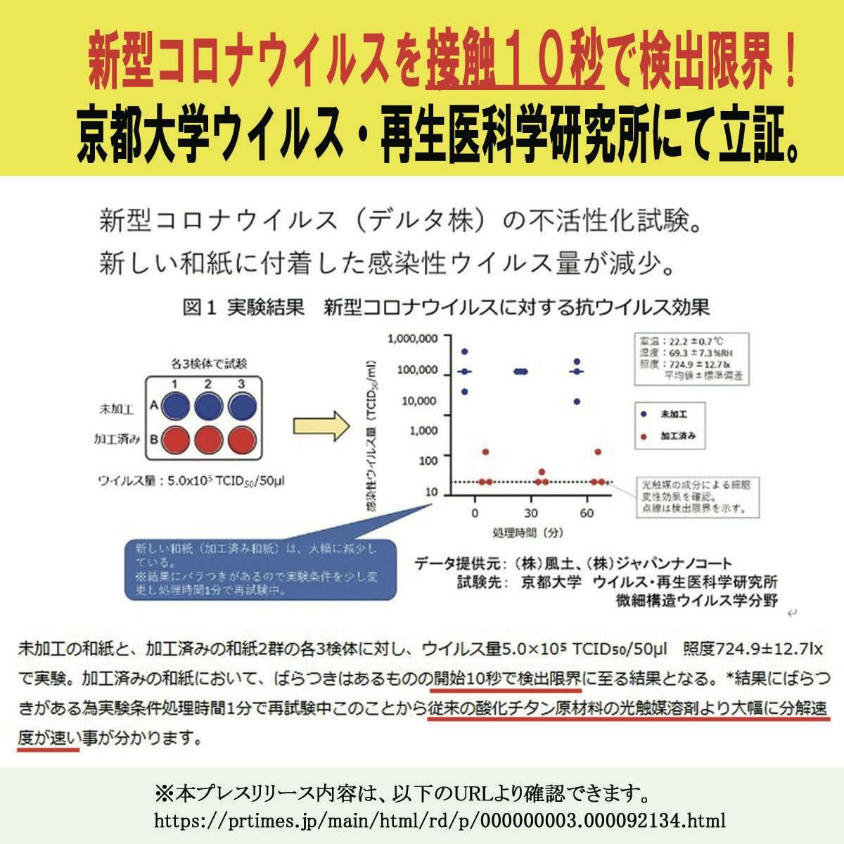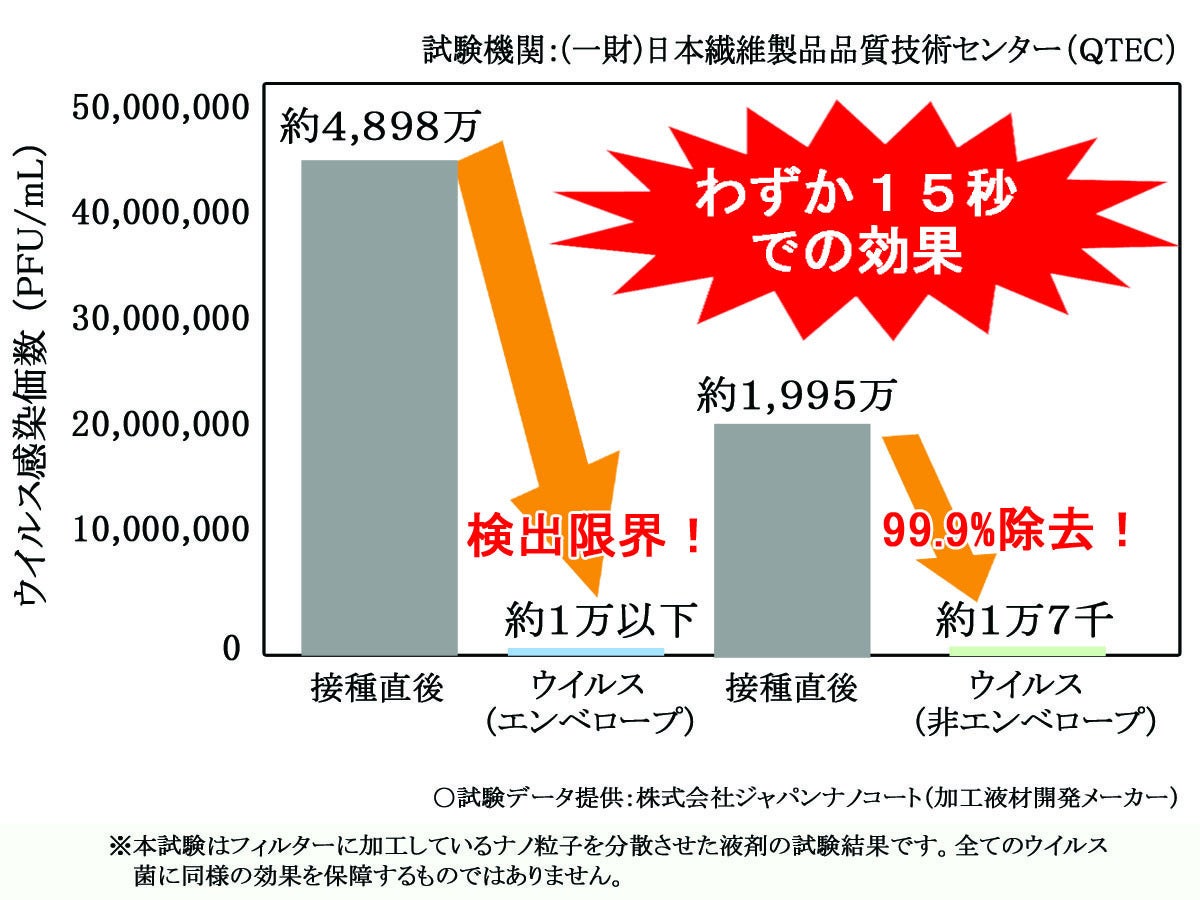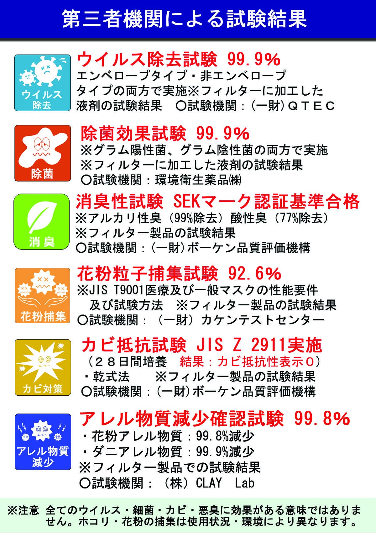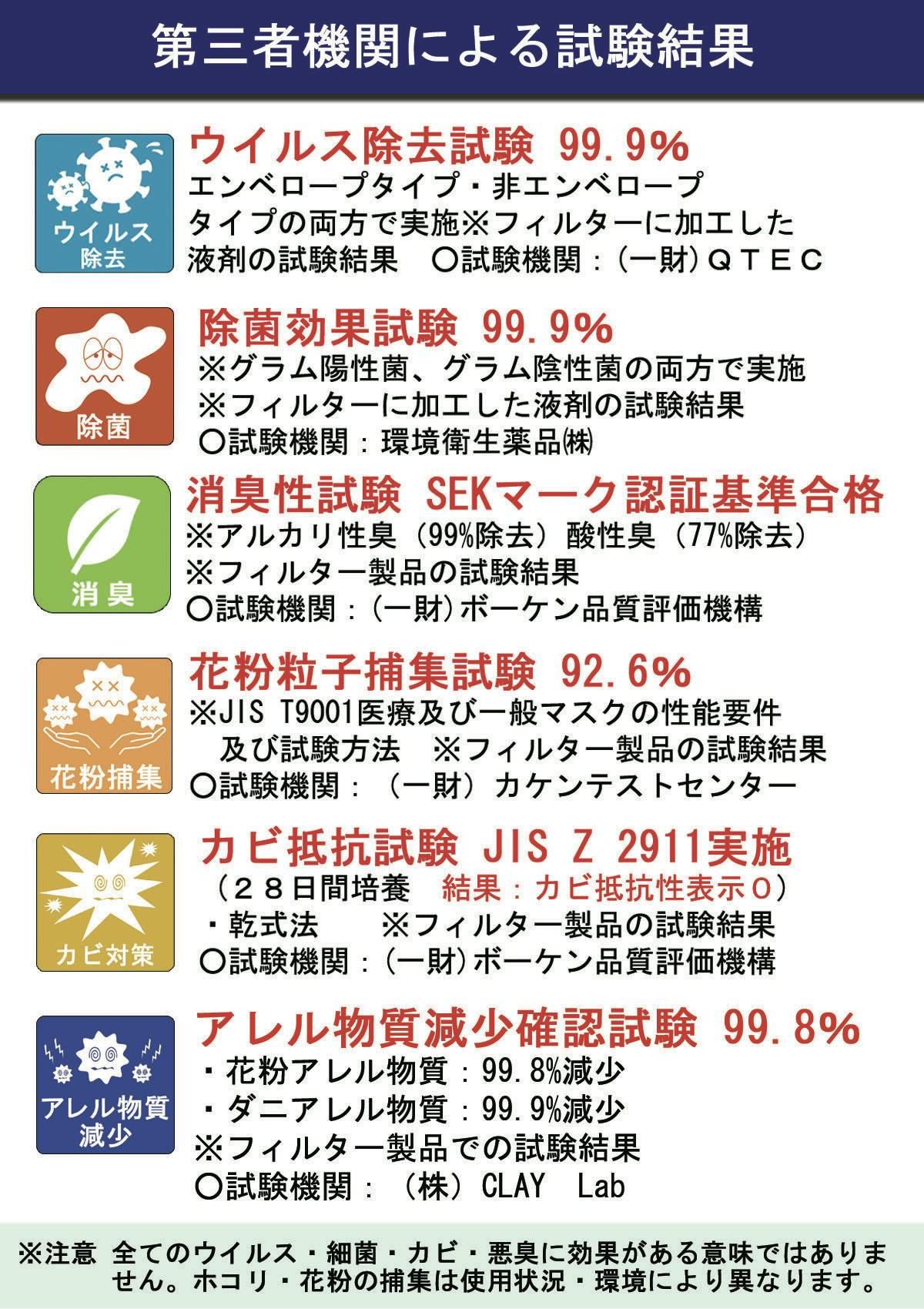 京都大学ウイルス・再生医科学研究所にての上記コロナウイルスに対する試験結果は、和紙に複合ナノマテリアルを加工したデータとなりますが、フィルターにも同じ㈱ジャパンナノコート社の複合ナノマテリアルを加工しています。