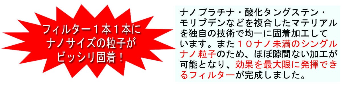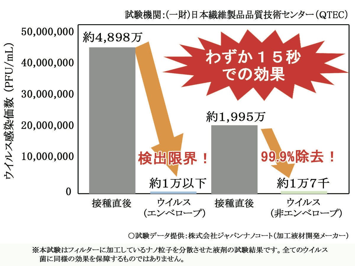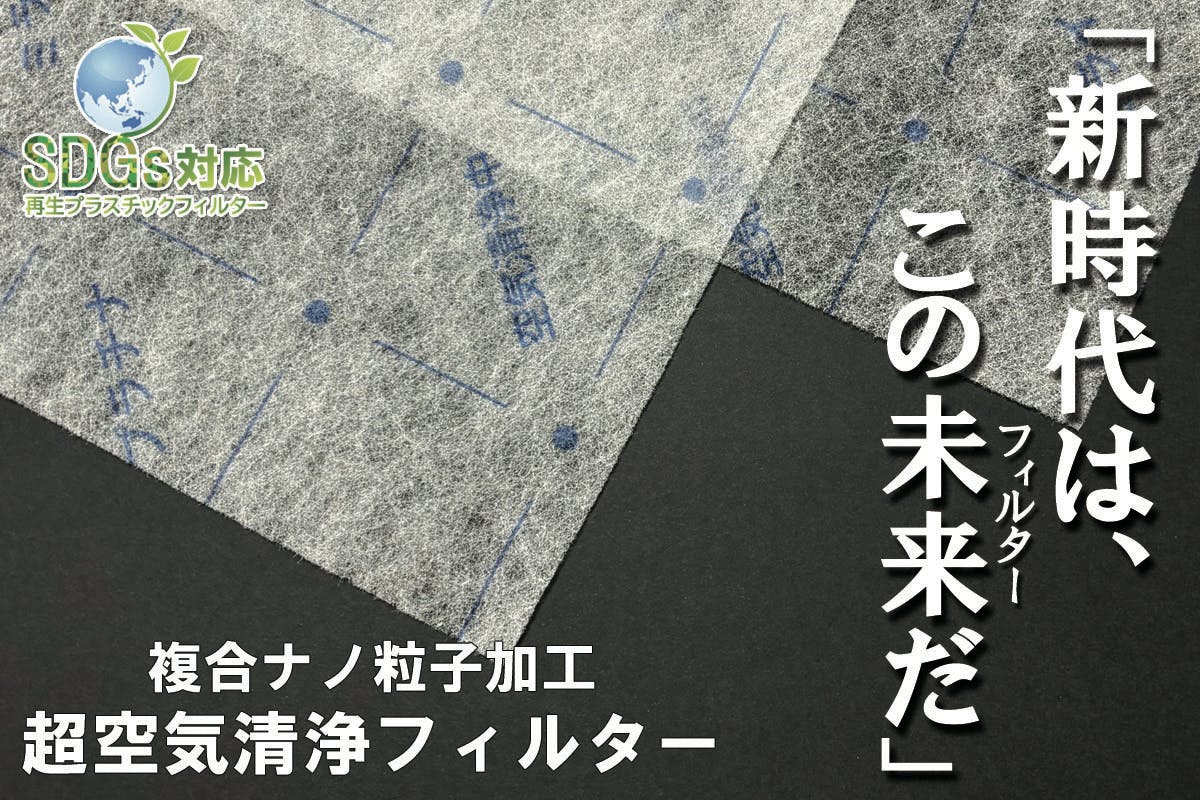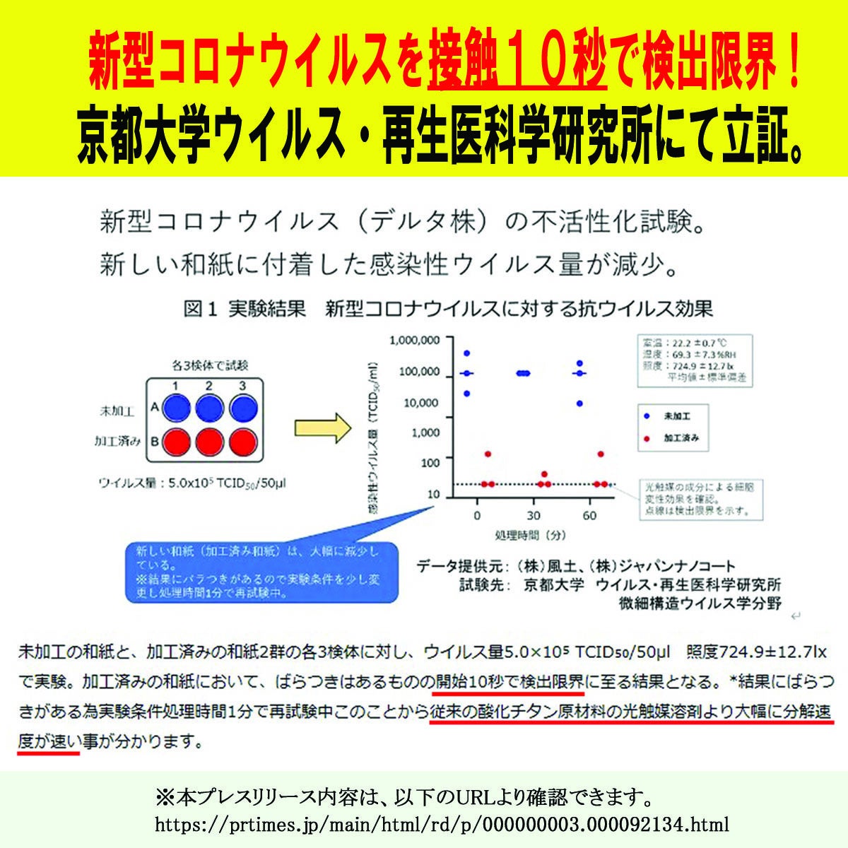 京都大学ウイルス・再生医科学研究所にての上記コロナウイルスに対する試験結果は、和紙に複合ナノマテリアルを加工したデータとなりますが、フィルターにも同じ㈱ジャパンナノコート社の複合ナノマテリアルを加工しています。