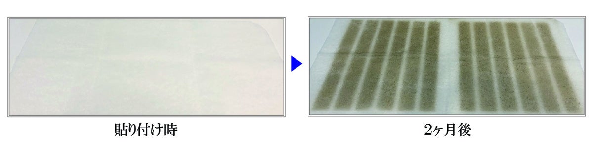 上記写真は一般家庭のレンジフードにプラチナミライフィルターを貼り付け、2ヵ月後に撮った写真です。フィルターに大くの油汚れが吸着されている事が分かります。