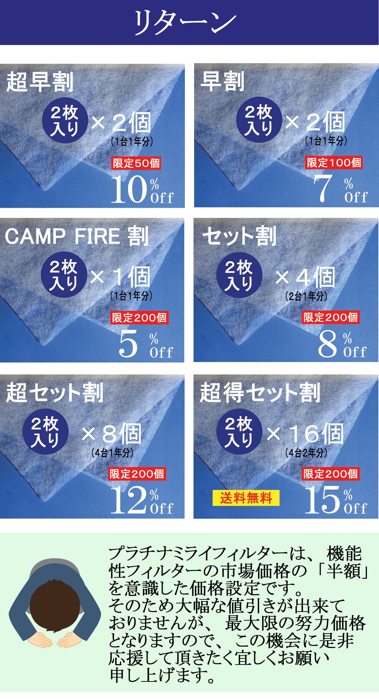 2024/10/23 16:30今回、初めてCAMP FIREのクラウドファンディングをやらせて頂く事となりました!しかし。。投稿しただけでは、どうやらほとんど見られないそうです。。慌てて宣伝してもらえるように申請した所でございます。クラファンは別の所で1度やった事があり、その時は本品は大反響を頂きました!きっと多くの方に見て頂ける機会があれば、支援をいただけると思います。製品品質だけは絶対に1番のフィルターと自負しておりますので!何卒、宜しくお願い申し上げます。 もっと見る