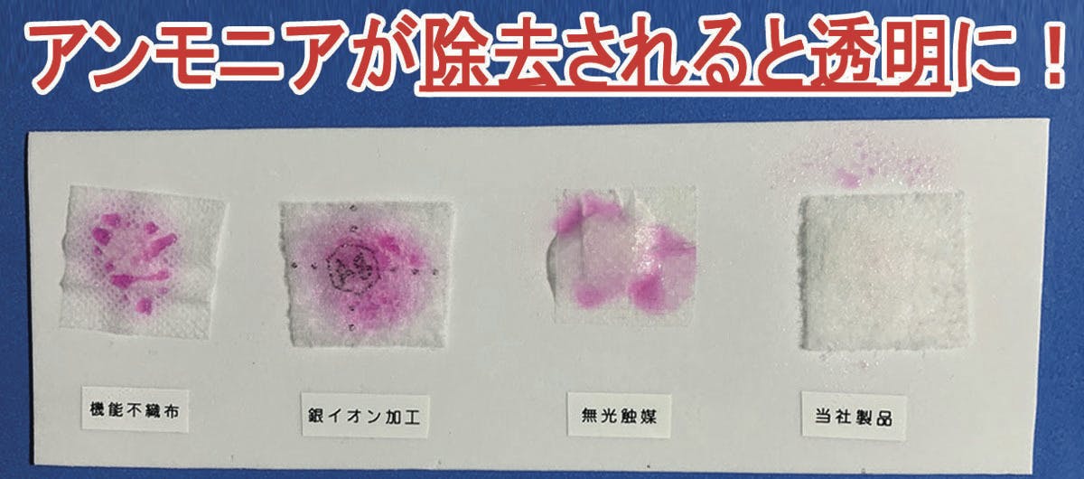 アンモニアなどの消臭効果があると言う各不織布と、プラチナミライフィルターの効果を比較試験しました。「当社製だけ」が数秒でアンモニアを除去している事が分かりました。