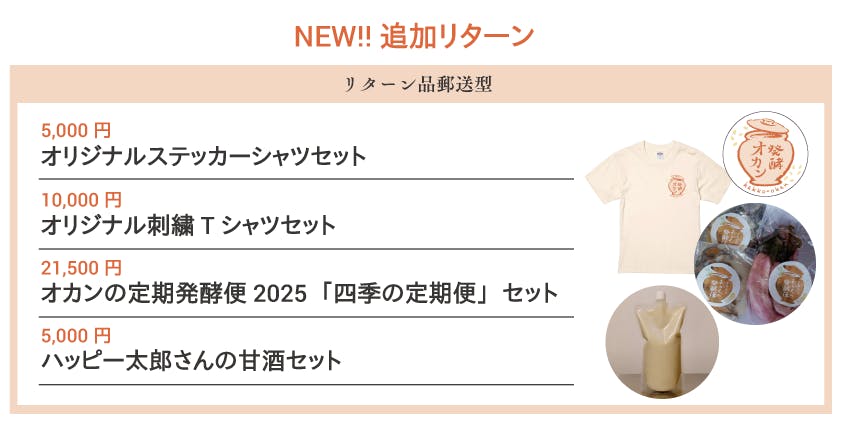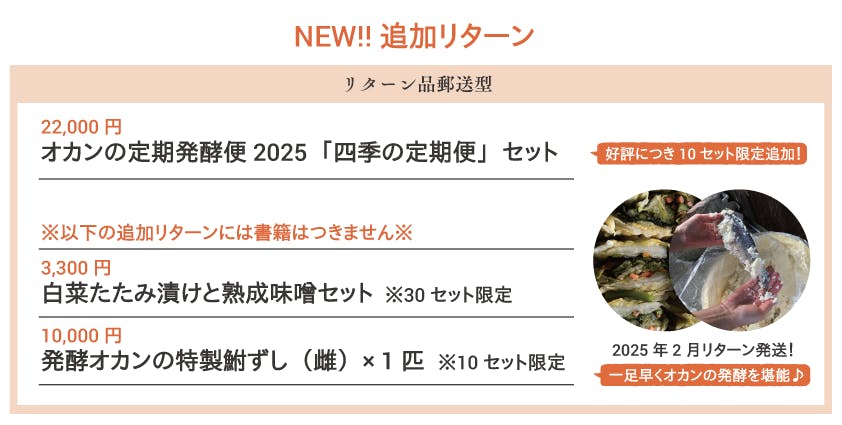 2025/01/13 13:02ツボのソコ事務局の植田です。昨年の10月25日から始まったクラウドファンディング、昨日皆様の応援で無事達成し終了することができました。改めてありがとうございました。発酵オカンと制作チームと共に来年秋の出版成功に向けて活動してまいります。また、発酵食の継承の課題に取り組んでいる我々ですが今後も・リアルイベントの開催・発酵オカン コミュニティづくり・新米オカン発掘など、活動を進めて行きます。私も参加したい!何かコラボしたい!などあればお声がけください。こちらの活動報告での投稿でも確認できますし、オカンも参加しているオープンチャットに参加していただければ大変うれしいです。オープンチャットURLhttps://line.me/ti/g2/bx74ciFdqtxCwjEeO5cRGMRBhWtzWov3xMgKVg?utm_source=invitation&utm_medium=link_copy&utm_campaign=default引き続き、宜しくお願いします。 もっと見る【いよいよ最終日23:59まで!】16時~X(Twitter)スペースにて配信あります!