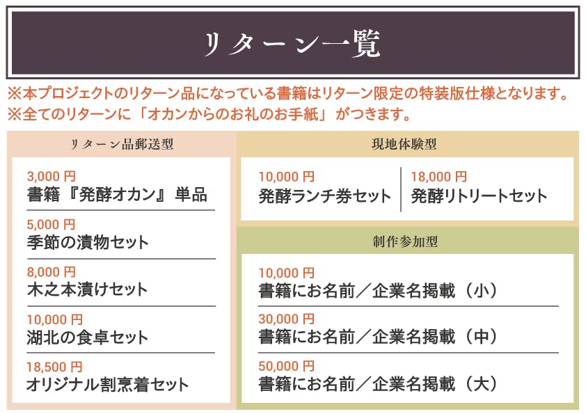 発酵オカンのみなさんとは「Bookcafeすくらむ」から始まり、「オカンの発酵便」をつくり全国に届けたりと、まちを盛り上げるために色々やってきました。いろんなご縁があり今回出版することになり、書籍を通して「発酵オカン」を切り口に木之本の事を知ってもらえる機会をもらいました!田舎が恋しい、食に興味がある、面白い人に会いたい!ぜひ、プロジェクトの一員になっていただき木之本にお越し頂けたら嬉しいです。