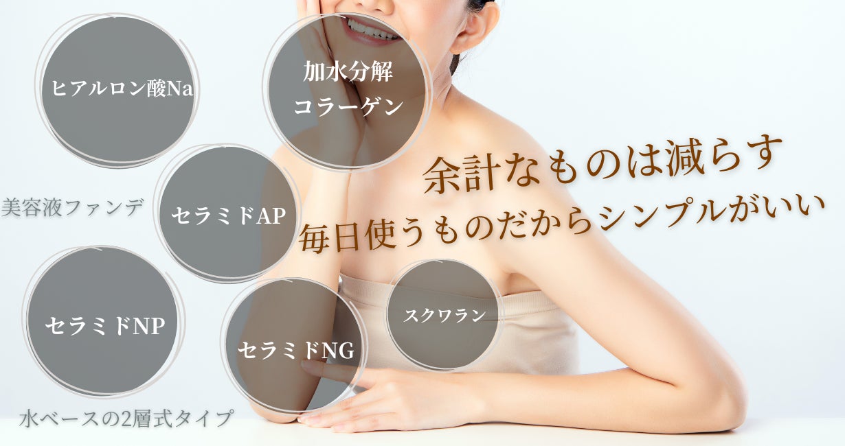 【全成分】水、プロパンジオール、グリセリン、エタノール、ミリスチン酸オクチルドデシル、ヒアルロン酸Na、ダイマージリノール酸ダイマージリノレイユビス(ベヘニル/イソステアリル/フィトステリル)、加水分解コラーゲン、セラミドNP、セラミドNG、セラミドAP、フィトステロールズ、スクワラン、ジイソステアリン酸ポリグリセリル-10、PCA亜鉛、BG、グリチルリチン酸2K、水添レシチン、マンダリンオレンジ果皮エキス、ラベンダー花エキス、アロエベラ葉エキス、ビルベリー葉エキス、フェノキシエタノール、トコフェロール、酸化チタン、酸化鉄、カオリン、マイカ、水酸化AI、ヒドロキシアパタイト、シリカ、酸化亜鉛