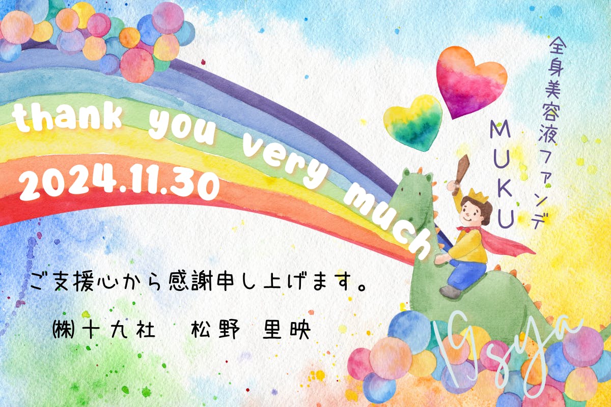 2024/12/01 12:36支援者の皆さまへこのたびは私たちのプロジェクト「全身美容液ファンデMUKUでイルカを守りたい!」にご支援いただき、誠にありがとうございました。皆さまのお力添えのおかげで、クラウドファンディングが無事成功を収めることができました。最終的に目標金額の143%を達成し、71名の方々にご支援いただけたこと、心より感謝申し上げます。支援してくださった皆さまの温かい励ましの言葉や応援メッセージが、プロジェクトを進めるうえで大きな原動力となりました。現在、リターンの最終発送準備中です。最終12月4日頃までにお届けできる予定です。またリターン品が届かない等ございましたらお手数お掛けしますがご連絡ください。進捗状況についても定期的にご報告いたしますので、引き続き見守っていただけますと幸いです。これからもプロジェクトの成功に向けて精一杯努力してまいります。どうぞ今後とも応援よろしくお願いいたします。改めまして、皆さまへの感謝の気持ちを込めて。人にやさしい 地球にやさしいその一歩株式会社十九社代表取締役 松野 里映感謝 もっと見る