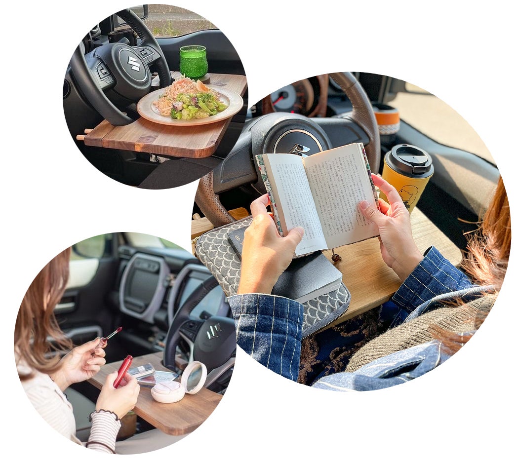クルマ旅での車中泊やドライブ先での車内でのランチタイムに便利。お弁当やお惣菜を置く平らな場所がなくて、センターコンソールボックスや斜めになっているダッシュボードに置いてひっくり返してしまった経験はありませんか?『車載デスク』なら平らな場所を瞬時に作り出し快適に食事を楽しむことができます。