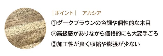 濃淡の木目や渦を巻くような模様が混じる様子は、世界の銘木であるウォールナットを連想させます。深い色味は落ち着いた雰囲気と、デザイン性の高さがアカシア材の特長です。また、曲がり、割れなどが少なく形状の安定性にも優れています。